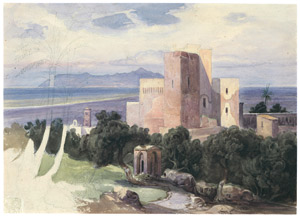 Süditalienische Landschaft mit verwittertem Olivenbaum und Palmen