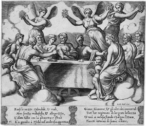 Ausgezeichneter, kräftiger Druck mit sehr feinem Rändchen um die Einfassung. Leicht flekcig, geringe gebrauchsspuren vornehmlich verso, sonst sehr gut. Beigegeben von demselben vier Kupferstiche "Priapus' Opfer" (B. 27), "Apollo und Marsyas" (B. 31), "Aeneas und Anchises" (B. 72) und "Zwei Gladiatoren" (B. 77), des Weiteren von Giulio Bonasone der Kupferstich "Zwei Satyrn führen Silen zu König Midas" (B. 89), von Gian Giacomo Caraglio "Proserpina" (B. 31), von Marcantonio Raimondi nach Albrecht Dürer "Die Fußwaschung" (B. 514), von Adamo Ghisi "Die mystische Vermählung der hl. Katharina (B. 7) sowie von Agostino Veneziano "Mann und Frau einander an den Händen haltend" (B. 471), insgesamt zehn Blatt.