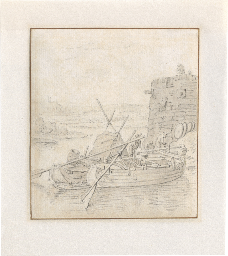 (1609 Rotterdam - 1685 Utrecht)Boote an einer Anlegestelle mit Rundturm