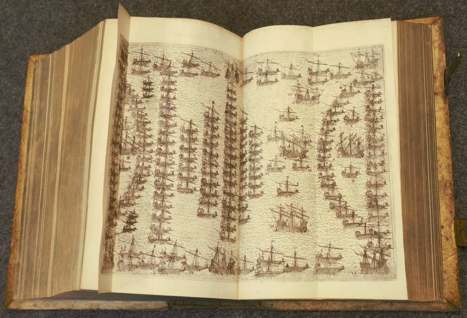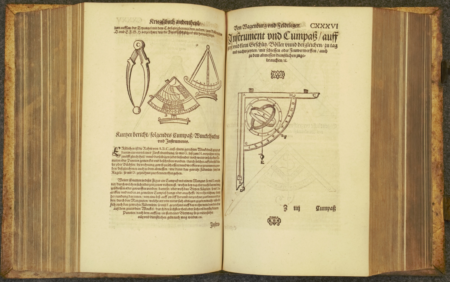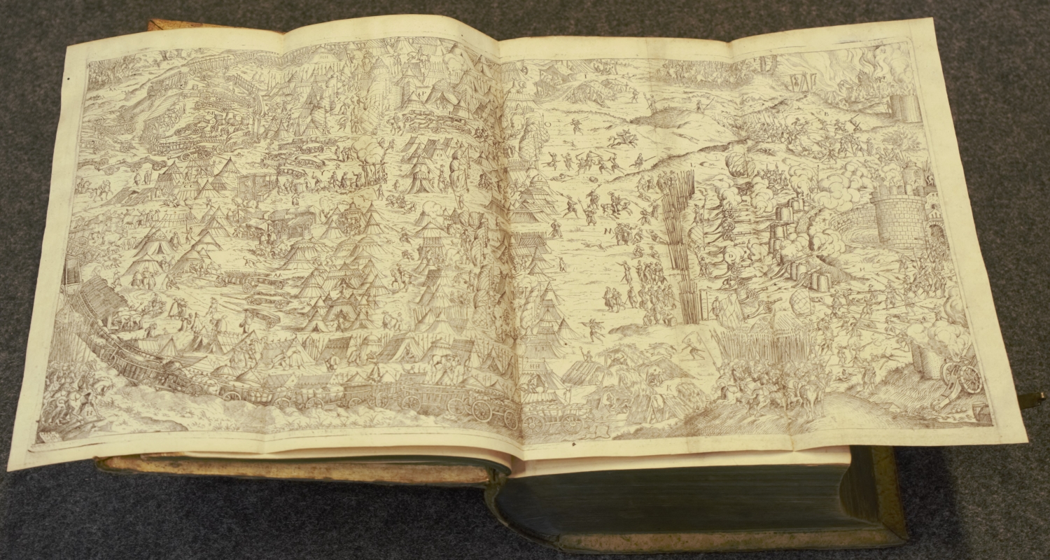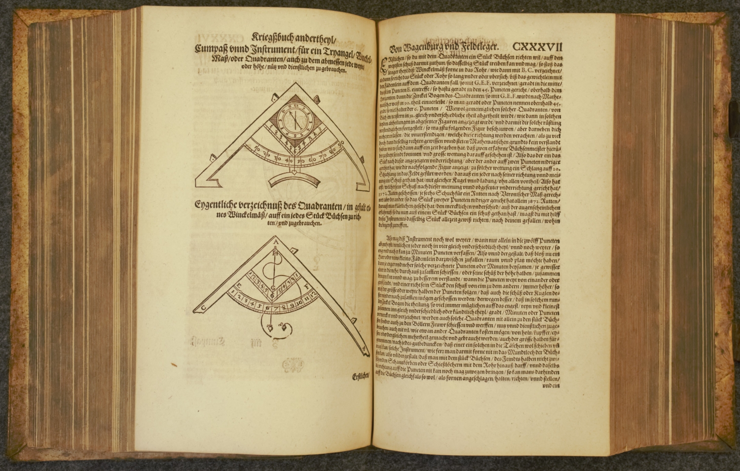 Fronsperger, Leonhardt. Von Kayserlichem Kriegßrechten, Malefitz und Schuldthändlen, Ordnung und Regiment ... [und:] Ander Theyl. Von Wagenburgk umb die Feldleger ... [und:] Dritter Theyl. Von Schantzen unnd Befestunngen. Teil I-III in 1 Band. Mit 4 Holzschnitt-Vignette auf dem Titel, 30 Kupfertafeln und zahlreichen Text-Holzschnitten. 1. und 2. Titel in Schwarz und Rot. 32 x 21 cm. Blindgeprägtes Schweinsleder d. Z. (berieben, bestoßen und mit kleinen Einrissen an den Kapitalen) über abgefasste Holzdeckel, 5 Bünde und 2 Messingschließen. Frankfurt, M. Lechler für H. Feyrabend, 1573.