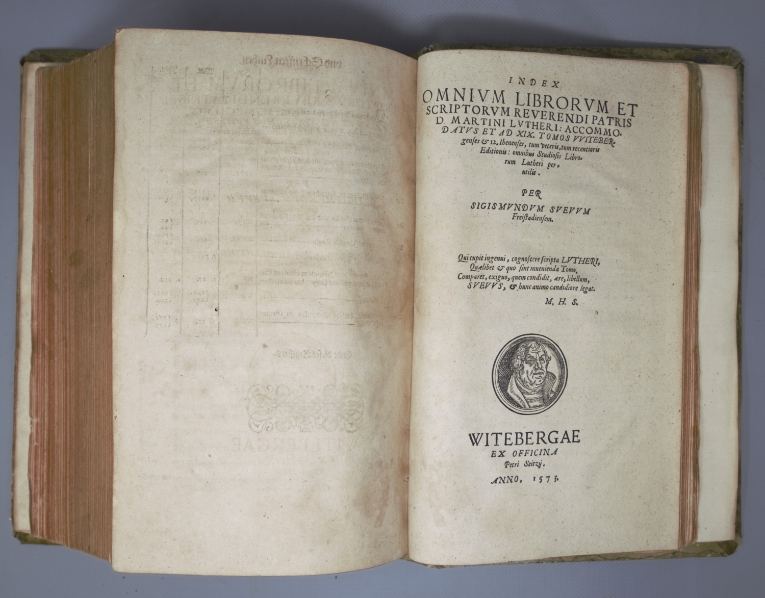 Benzing 1. Vgl. VD16 L 3343. – Frühe Ausgabe aus der Offizin von Hans Lufft des zwöflten und letzten Teil der Lutherischen Gesamtausgabe. – Papierbedingt gebräunt, leicht braunfleckig, vereinzelt mit kleinen Wurmlöchern und -gängen und teils mit Randläsuren. Der einst prachtvolle Einband mit großen, teils abgeriebenen Versalien, einst in Goldprägung (nunmehr meist oxidiert): "M [...] H M, HENNINCK HALBERSTAD, G V D S N ILSE HOLSTEIN 1597". Möglicherweise handelt es sich um ein Hochzeitsgeschenk für eine Halberstädter Adelsfamilie, der Name Henninck ist im Halberstädtischen sehr häufig.