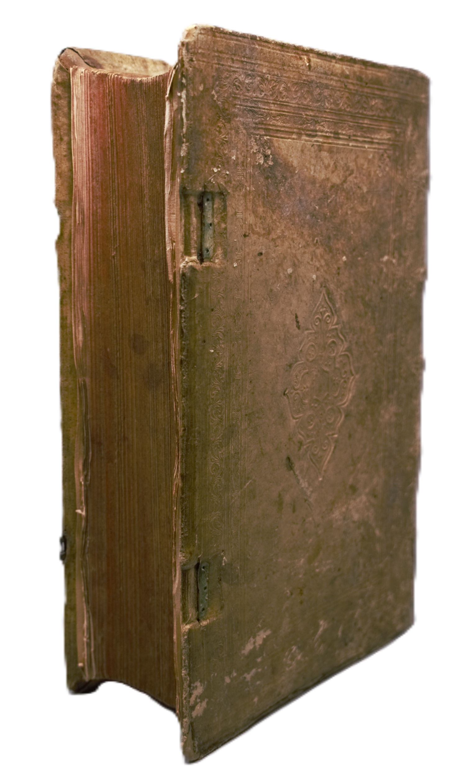 Luther, Martin. Der Zwelfte und letzte Teil der Bücher. 8 nn., 483 num, 74 nn. Bl. Mit Holzschnitt-Vignette auf dem Titel, 2 Holzschnitt-Porträts und Holzschnitt-Buchschmuck im Text. 31 x 19,5 cm. Blindgeprägtes Schweinsleder (berieben, fleckig mit kleinen Wurmlöchern sowie mit Fehlstellen) mit blindgeprägtem Besitzvermerk in einst goldenen (jetzt meist oxidierten) Versalien auf dem Vorderdeckel (ohne die Messingschließen). Wittenberg, Hans Lufft, 1572.