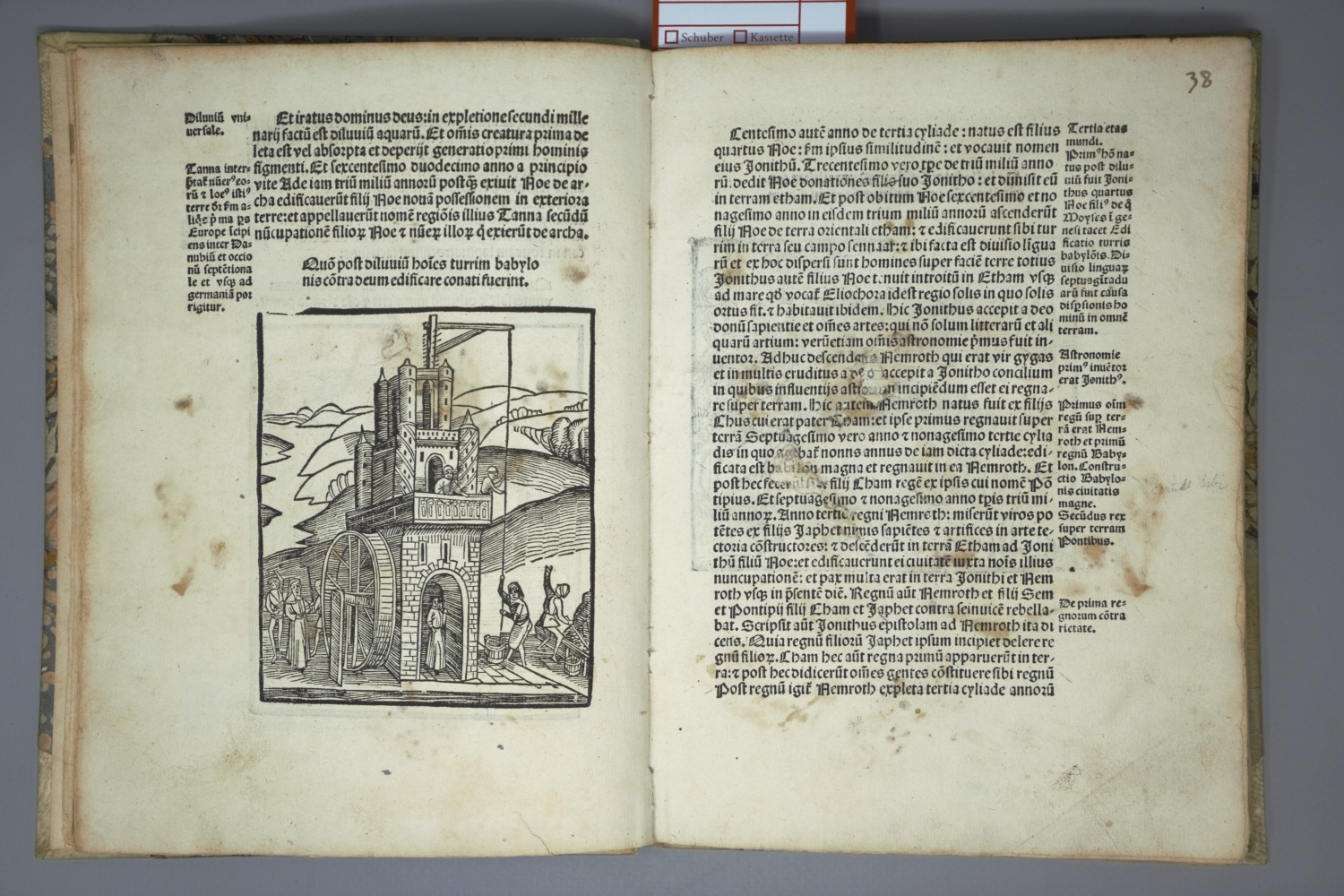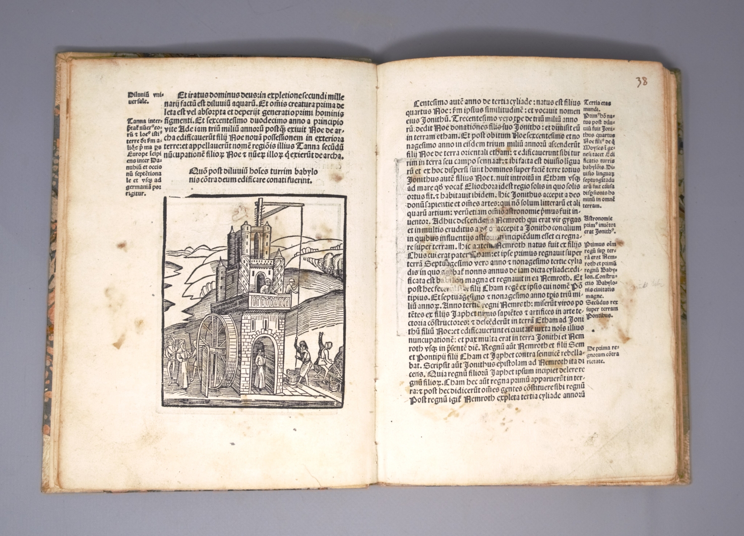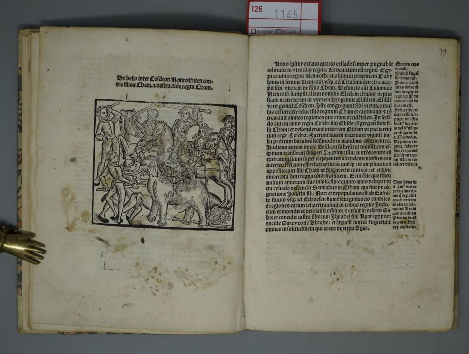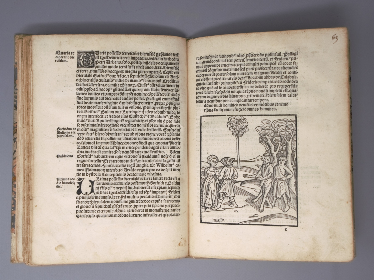 Lange nahm man an das die Weltchronik von dem Bischof Methodius von Olympos (gest. 312) verfasst wurde, jedoch enstand das Werk erst im 7. Jahrhundert, sodass der anonyme Autor heute als Pseudo-Methodius bekannt ist. "Written with the idea of exciting the animosity of the Christians against the Turks" (Fairfax Murray). – Zwei Exlibris. Titel am Steg an ein neueres Vorsatzblatt montiert. Die ersten 4 Blättern (einschließlich Titel) mit kleinen Ausrissen (auch in die Darstellungen), diese hinterlegt und mit schwarzer Tinte nachgezeichnet, wenige Blätter mit hinterlegten Einrissen (ohne Textverlust). Vereinzelte hs. Bemerkungen, durchgehende hs. Nummerierung und kleiner Wasserrand oberhalb. Anfangs stärker braun- und sporfleckig, zum Ende hauptsächlich leicht fingerfleckig.