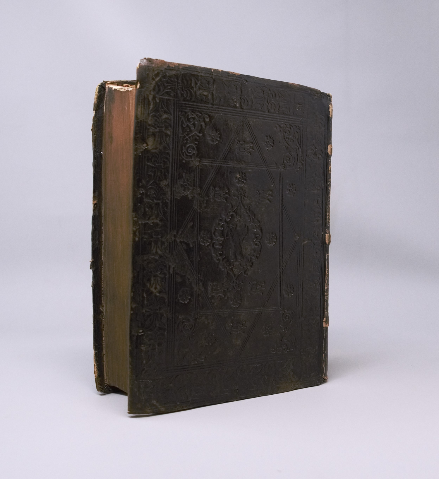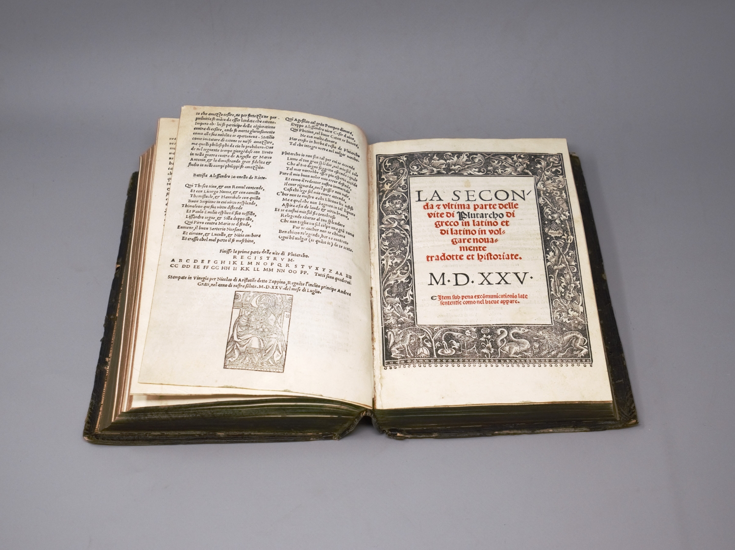 EDIT 16 CNCE 41051. Sander 5787f. Nicht bei Adams und im STC. – Seltener zweispaltiger Druck von Plutarchs Parallelviten in der Übertragung in die italienische Volkssprache durch Battista Alessandro Jaconellos. – Titel etwas fingerfleckig, drei Blatt zu Beginn mit alter Tintenkorrektur des Kolumnentitels, anfangs mit verblasstem Feuchtigkeitsrand, sonst nur vereinzelte Flecken und insgesamt wohlerhalten. Innenspiegel mit Exlibris. Der zeitgenössische Einband mit Darstellung eines Cherubims mit gespanntem Bogen im Mittelfled, umgeben von Drachenköpfen und kleinen Blumenstempeln sowie ornamentaler Bordüre und Streicheisenlinien.