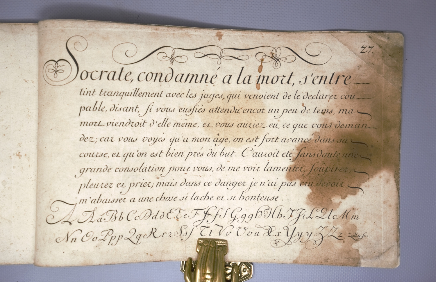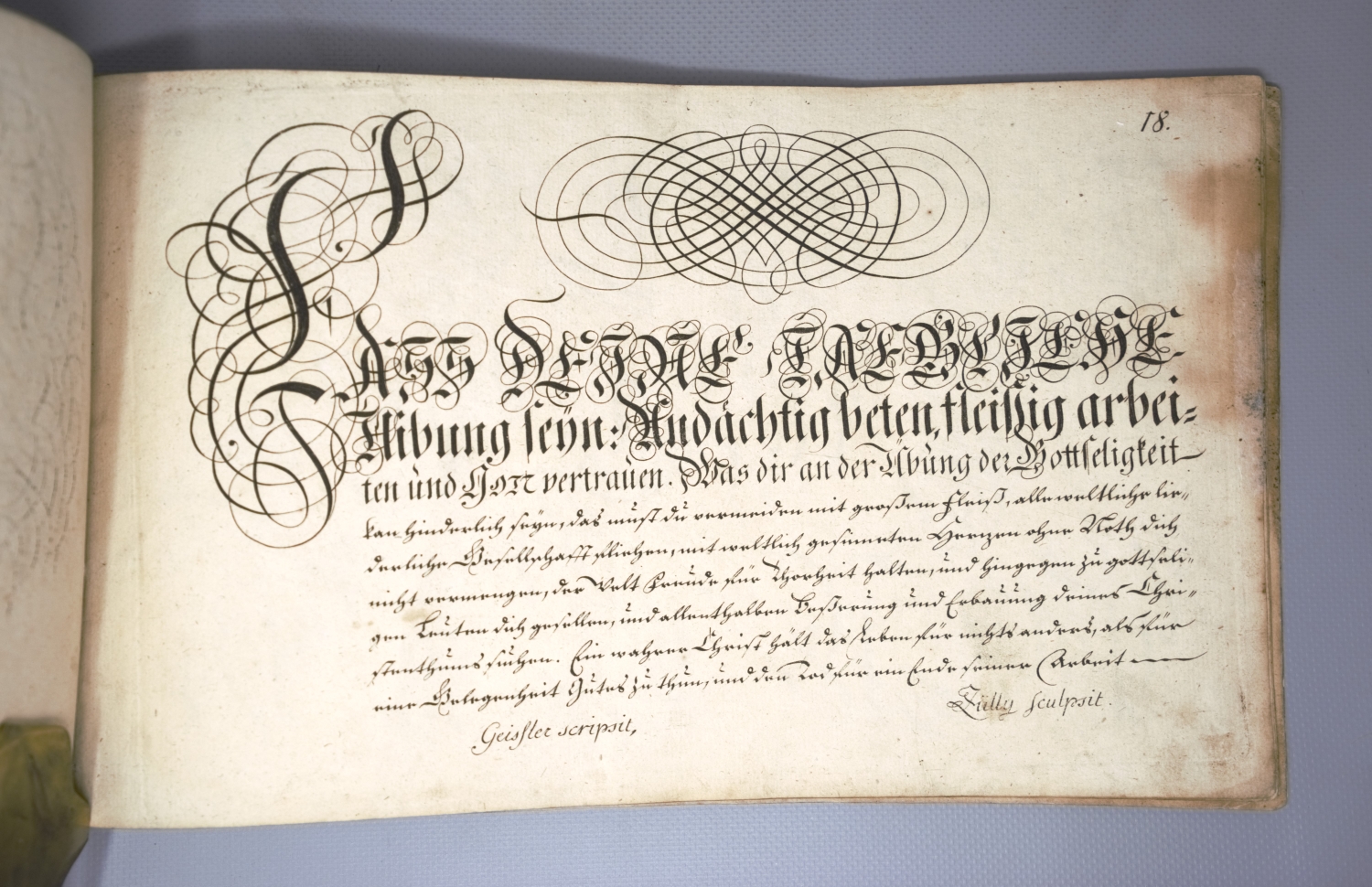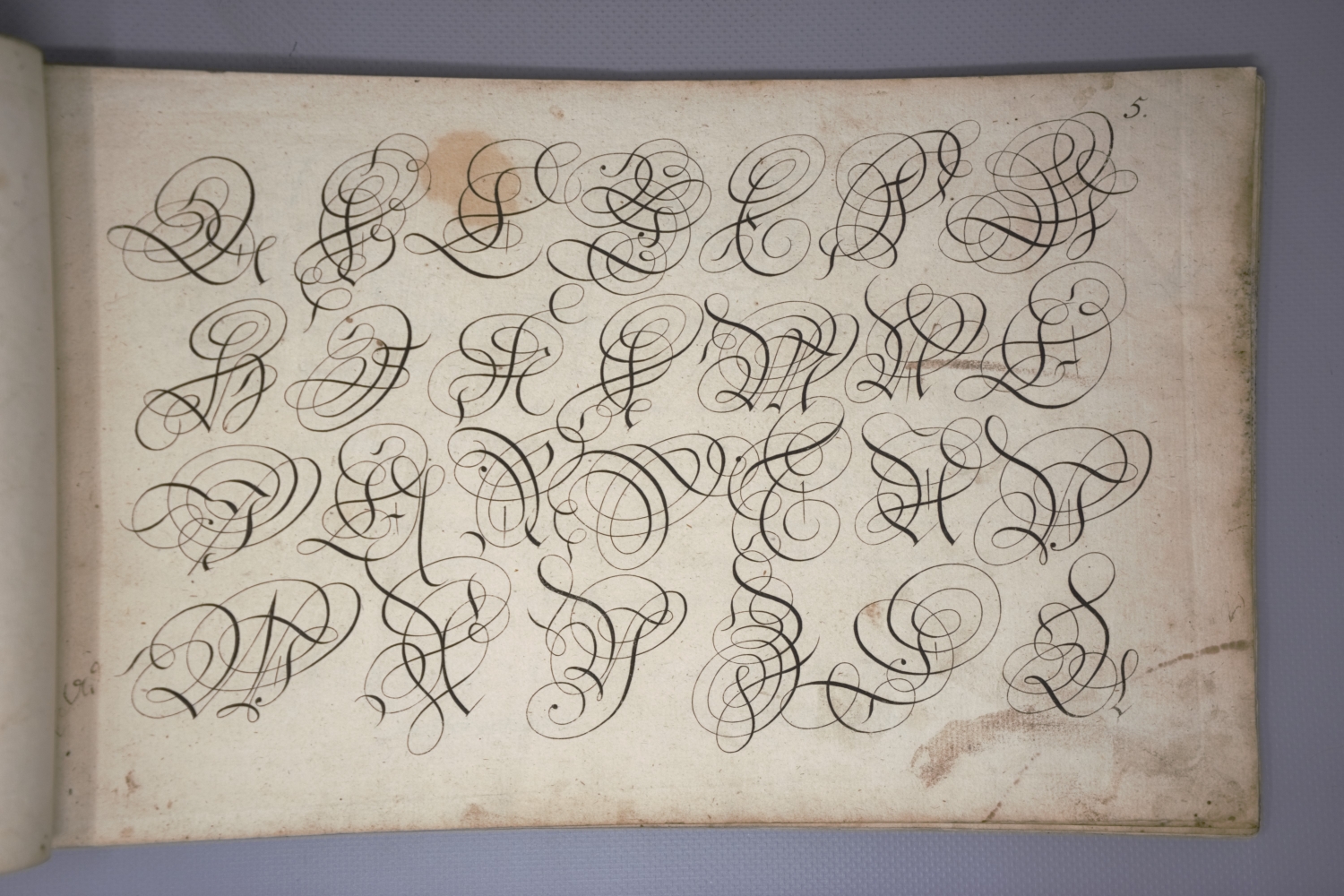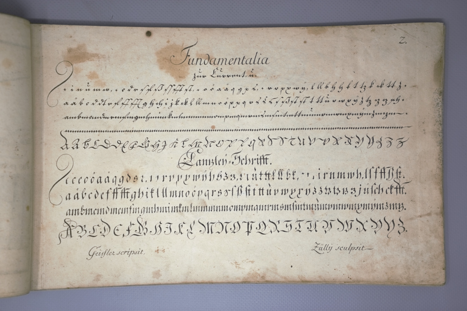 Bonacini 661. Berliner Ornamentstichkatalog 4876. – Seltenes Dresdner Schreibmeisterbuch. Die erste Tafel zeigt Schreibgeräte sowie die Grundhaltungen des Schreibers, die übrigen Tafeln mit barocken Schriftmustern. – Mal mehr, mal weniger fingerfleckig, stellenweise im Rand hinterlegt, vor allem am Schluss mit stärkerem Braunfleck, Kupfertitel und Schlussblatt komplett mit Japan hinterlegt. Durchgehend behutsam und fachmännisch restauriertes Exemplar. Lose beiliegend eine geheftete bibliographische Dokumentation.