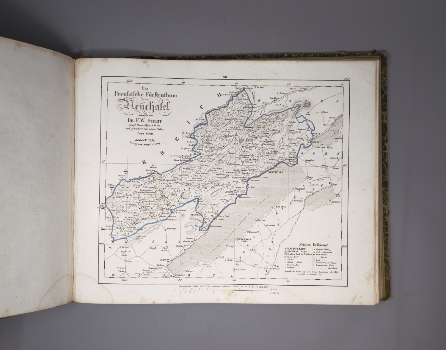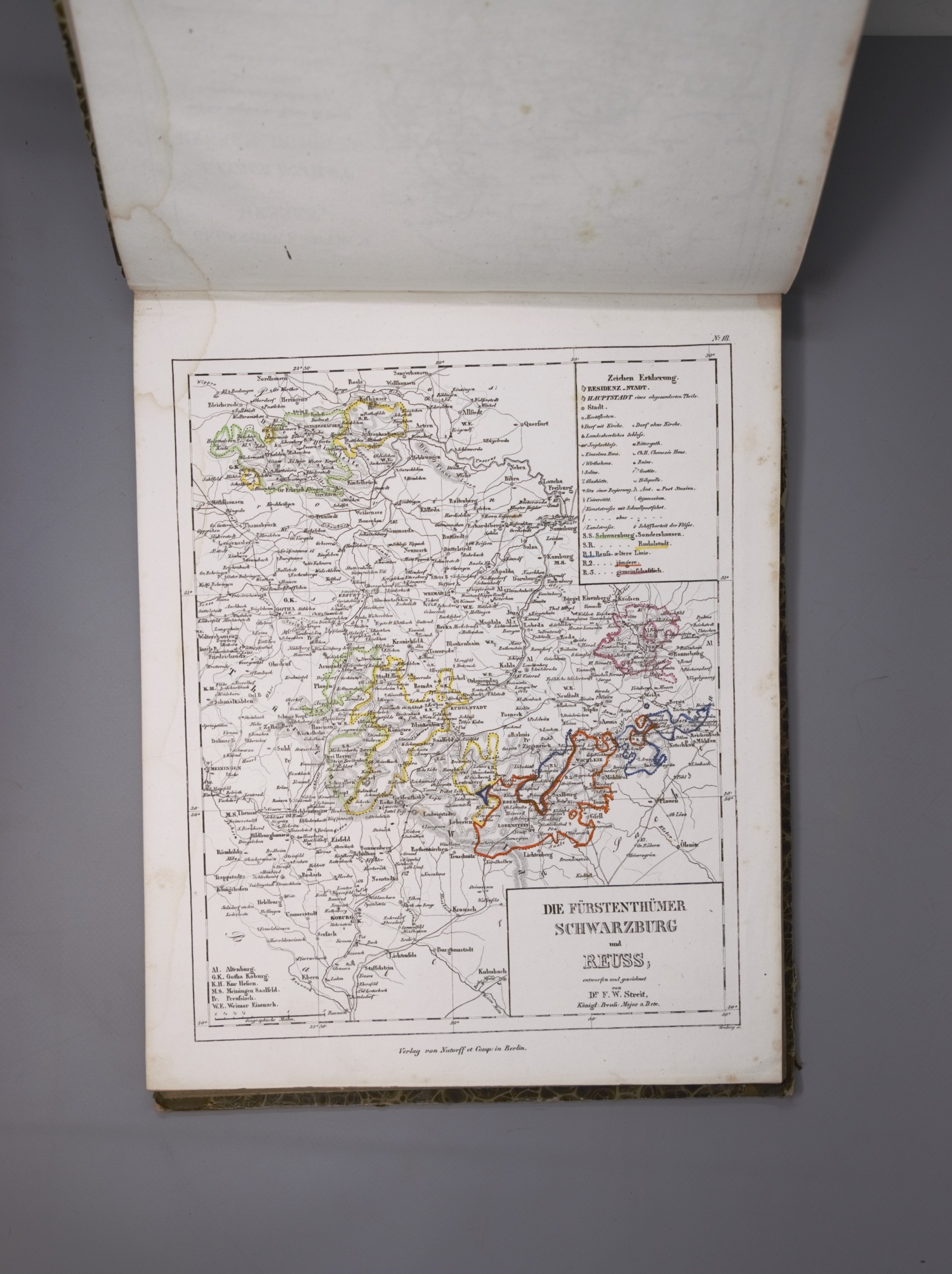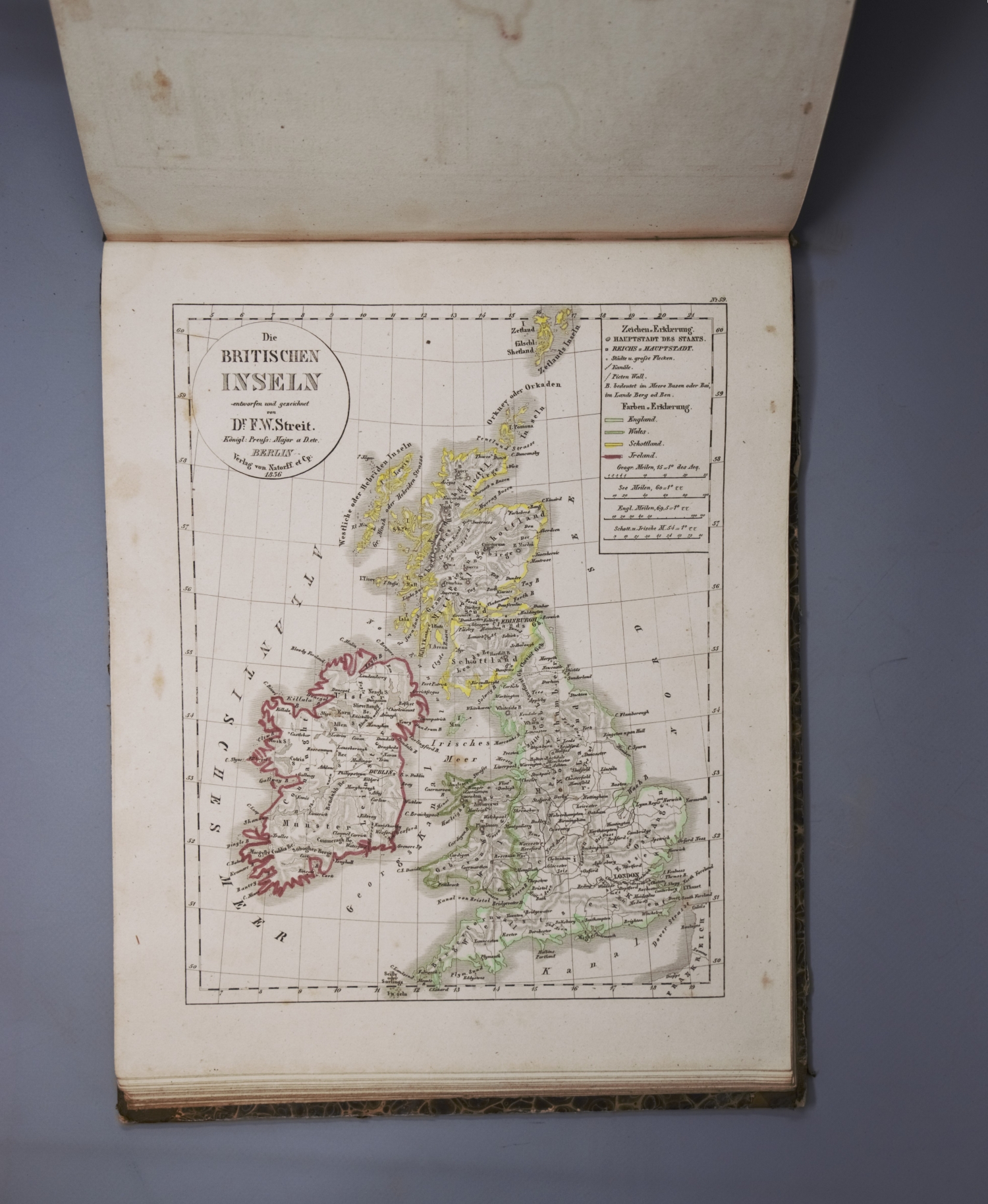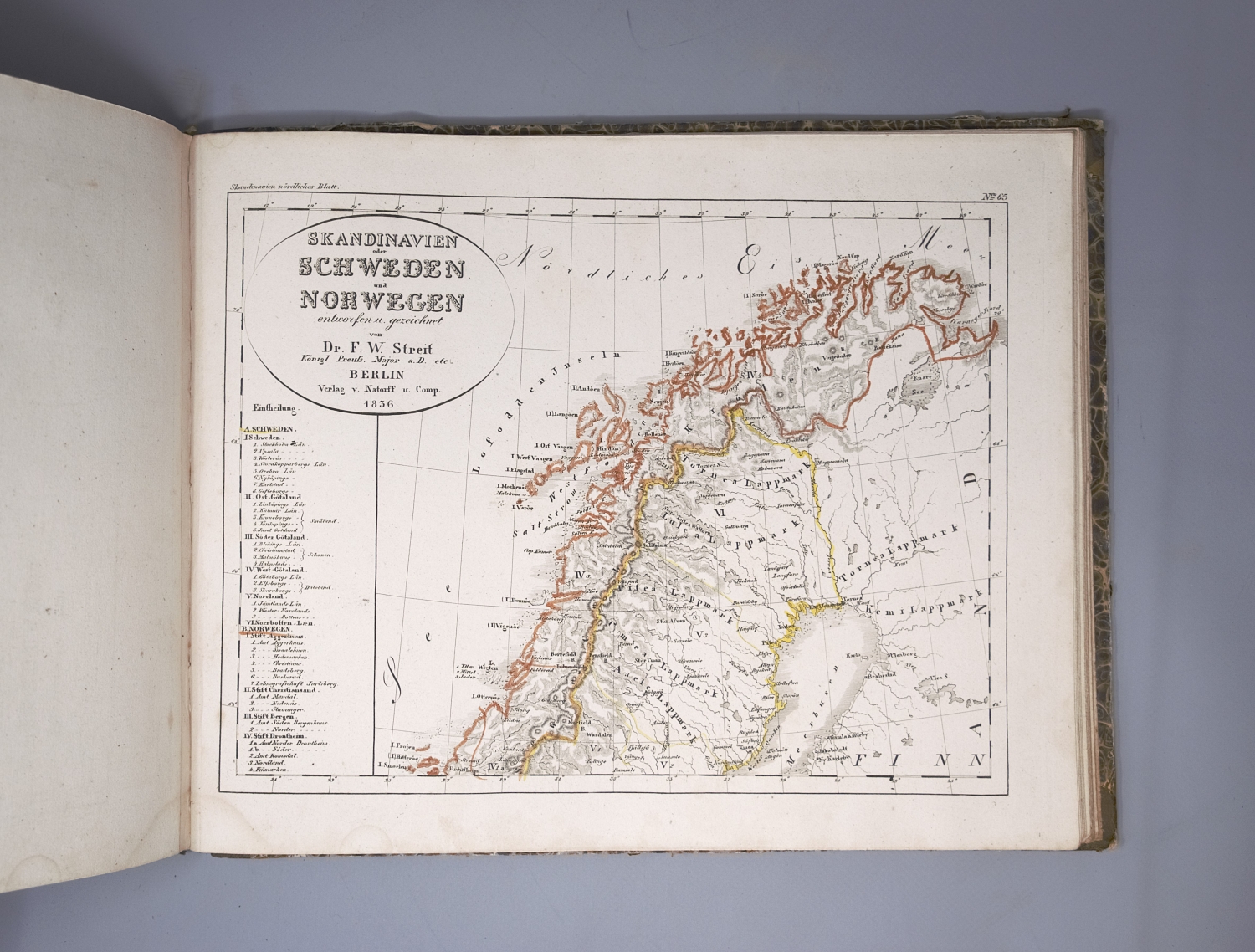 Streit, F. W. Atlas von Europa. 1 Bl. (Verzeichnis). Mit gestochenem Titel und 82 (78 grenzkoloriert) gestochenen Karten. 26 x 32,5 cm. Halbleder d. Z. (berieben und bestoßen, Bezugspapier mit teils größeren Schabspuren). Berlin, W. Natorff, 1837.