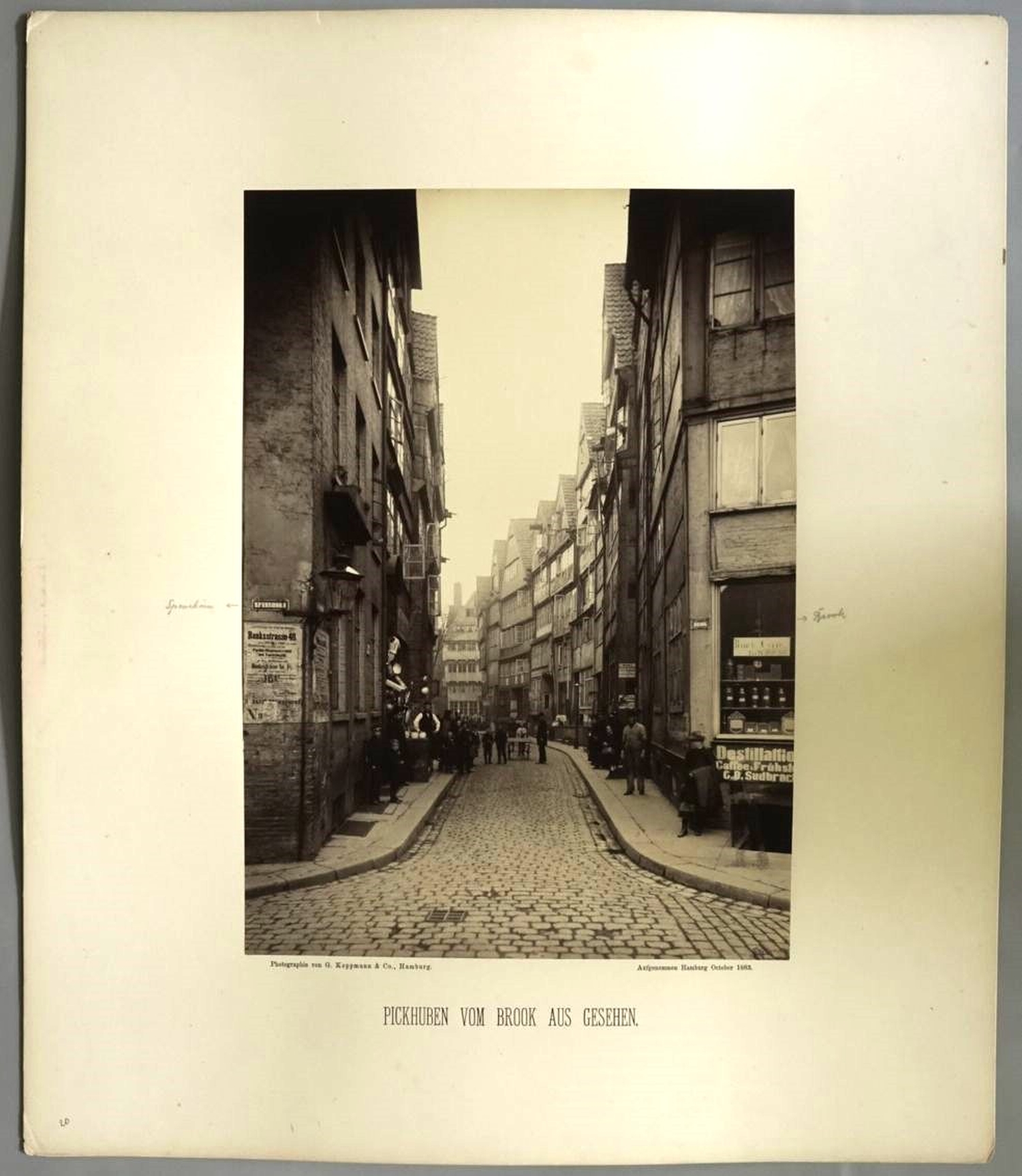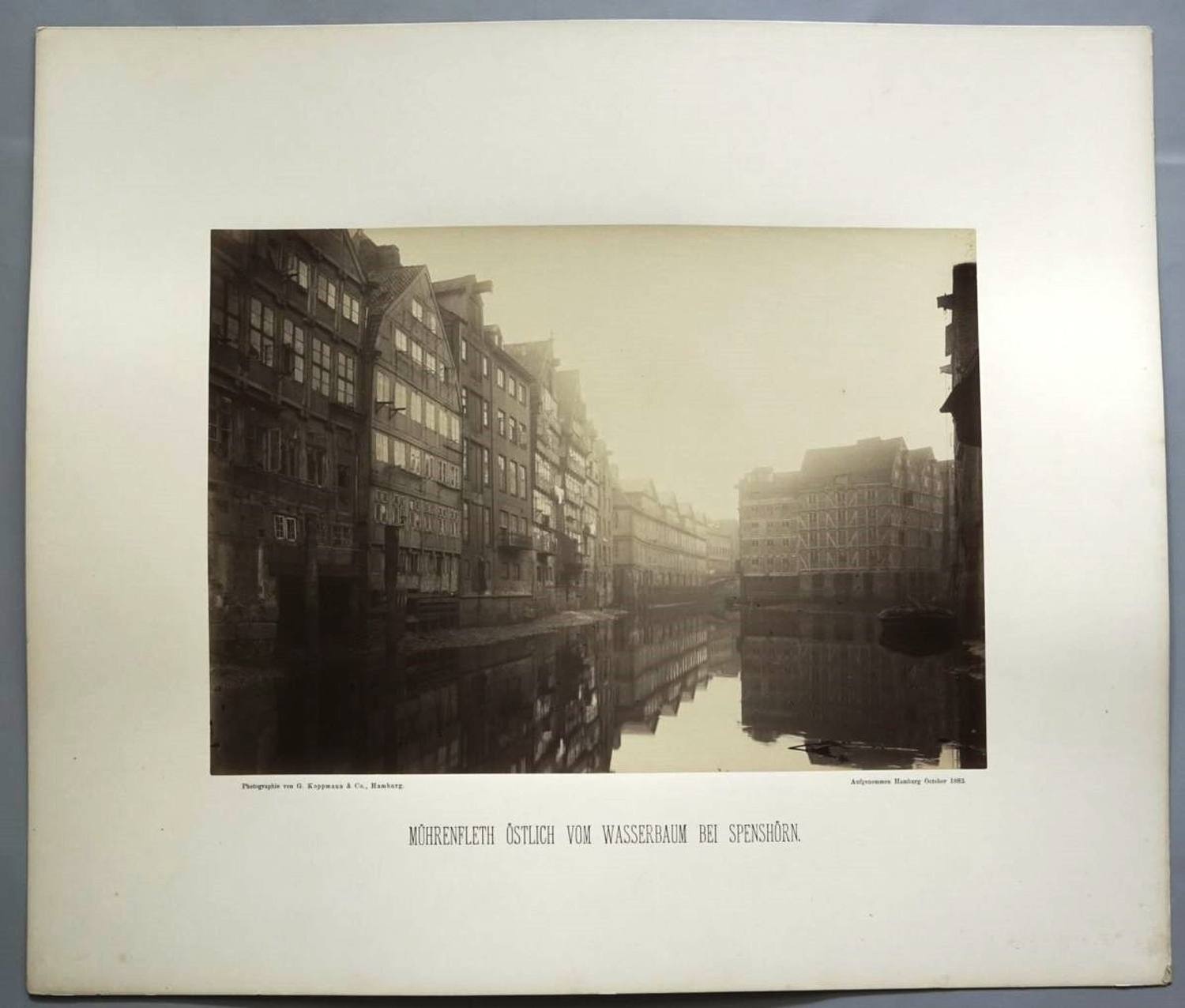 Heidtmann 17389. – Die Tafeln zeigen zahlreiche Straßen und Plätze Hamburgs, wie zum Beispiel: "Hohebrücke", "Brook von Osten aus gesehen", "Kleines Fleth vom Sandthorquai aus gesehen", "Englische Kirche am Johannisbollwerk II", "Mührenfleth östlich vom Wasserbaum bei Spenshörn", "Am Stadtdeich I.", "Am Stadtdeich II.", "Ansicht der Rathswaage", "Kehrwieder von der Hellenenbrücke aus gesehen", "Niederbaumbrücke", "Rathhausmarkt", "Kehrwieder No. 74" etc. – Teils leicht gewellt und Karton mit Einrissen, Fehlstellen und teils kleinen Gebrauchsspuren. Fotografien vereinzelt leicht verblasst, sonst gut erhalten.