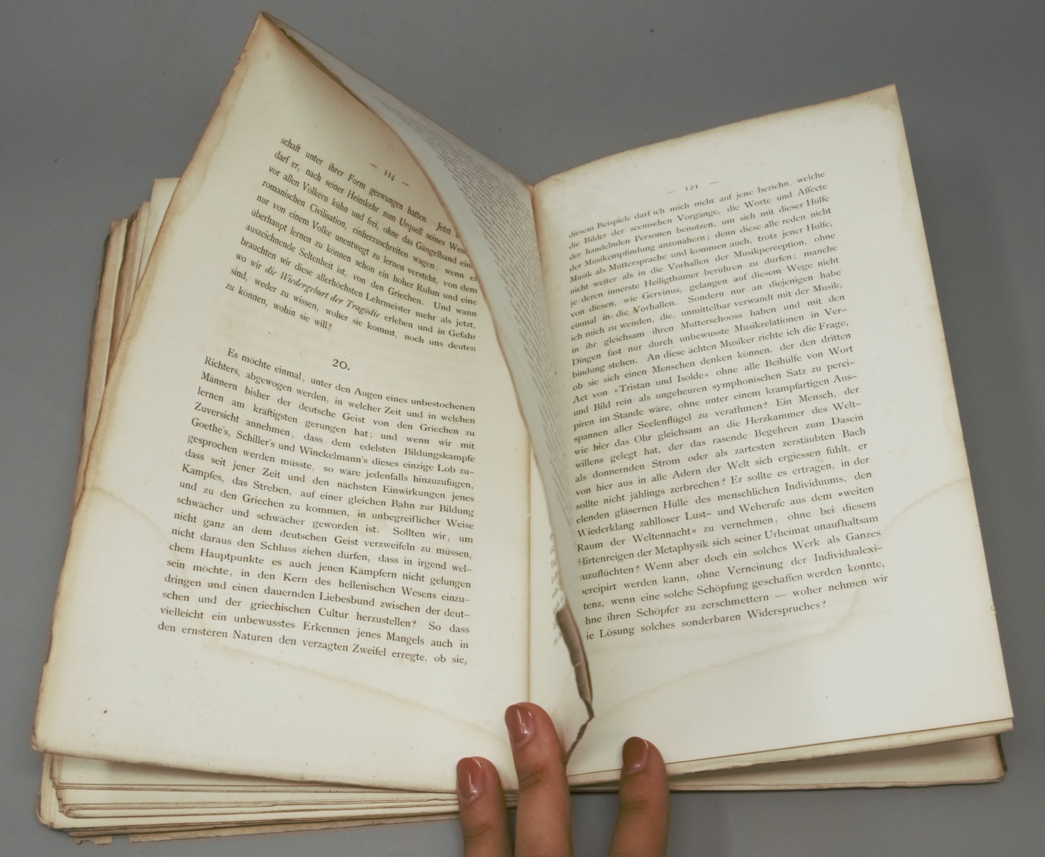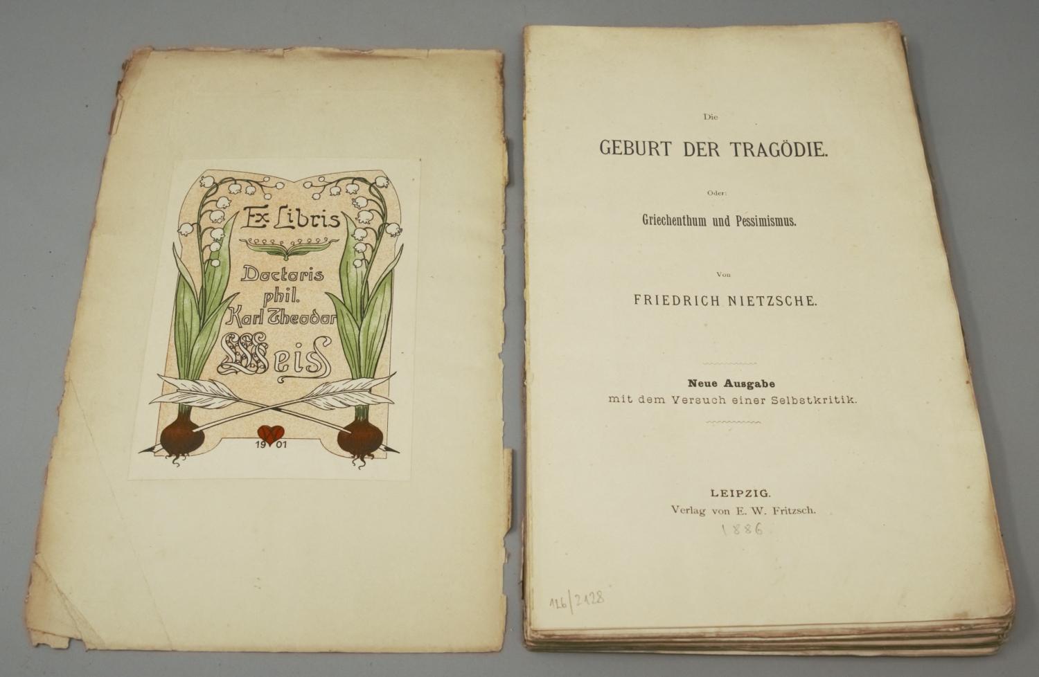 WNB 25. – Erster Druck der erweiterten Fassung. Nach Abschluss des Zarathustra konnte sich Nietzsche der Neuausgabe und Überarbeitung bereits erschienener Werke widmen. So veranstaltete er mit seinem wiedergewonnenen Verleger Fritzsch unter Verwendung noch vorhandener Restbogen sogenannte Titelauflagen. Bei Die fröhliche Wissenschaft und Die Geburt der Tragödie wurden jedoch nicht nur die Titelblätter erneuert, Nietzsche verfasste zudem bedeutende Vorreden, die hier erstmals im Druck erschienen. Seine wirkungsmächtige Basler Frühschrift über das Dionysische und das Apoollinische erschien zuerst im Mai 1872. "Unter dem Zauber des Dionysischen schließt sich nicht nur der Bund zwischen Mensch und Mensch wieder zusammen: auch die entfremdete, feindliche oder unterjochte Natur feiert wieder ihr Versöhnungsfest mit ihrem verlorenen Sohne, dem Menschen." Nietzsches Schrift über Entstehung und Niedergang der griechischen Tragödie wurde von der etablierten Philologie aufgrund seiner intuitiven und irrationalen Schlüsse nicht ernst genommen und weitgehend ignoriert. Lediglich der junge Wilamowitz-Möllendorff, mit dem Nietzsche gemeinsam in Schulpforta die Schulbank drückte, wagte einen öffentlichen Tadel: "herr Nietzsche tritt ja nicht als wissenschaftlicher forscher auf: auf dem wege der intuition erlangte weisheit wird teils im kanzelstil, teils in einem raisonnement dargeboten, welches dem journalisten nur zu verwandt ist." Erwin Rohde sprang seinem Freund Nietzsche zur Seite und veröffentlichte seine Erwiderungsschrift Afterphilologie, in der er Nietzsches Thesen verteidigt und gegen Wilamowitz polemisiert. – Lagen zumeist lose. Unaufgeschnittenes und unbeschnittenes Exemplar mit Feuchtigkeitsrändern. Innenspiegel mit großem Jugendstil-Exlibris des Philologen und Wasserzeichenforschers Karl Theodor Weiß (1872-1945).