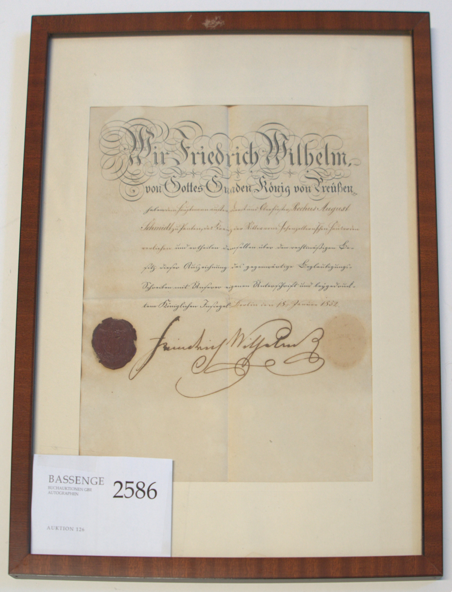 Friedrich Wilhelm IV., König von Preußen (1795-1861). Urkunde m. U. "Friedrich Wilhelm R" und Majestätssiegel. 1 S. Folio. Gerahmt und mit dem Umschlag unter Glas montiert. Berlin 18.I.1852.