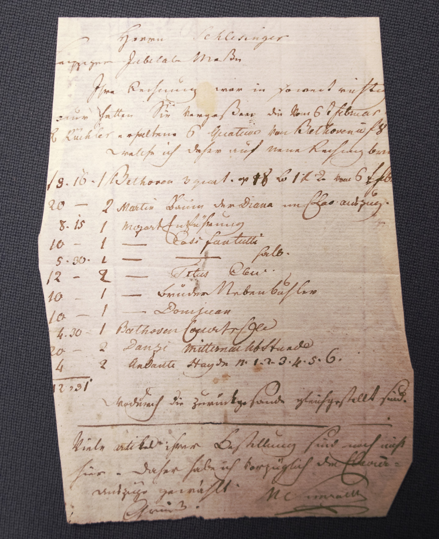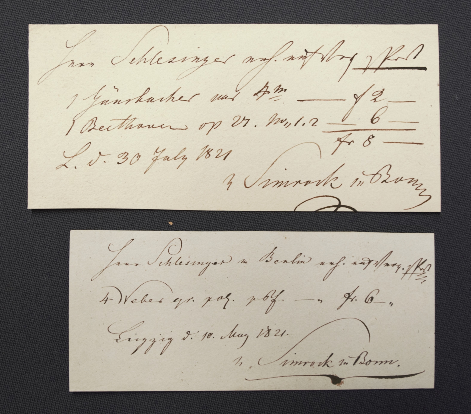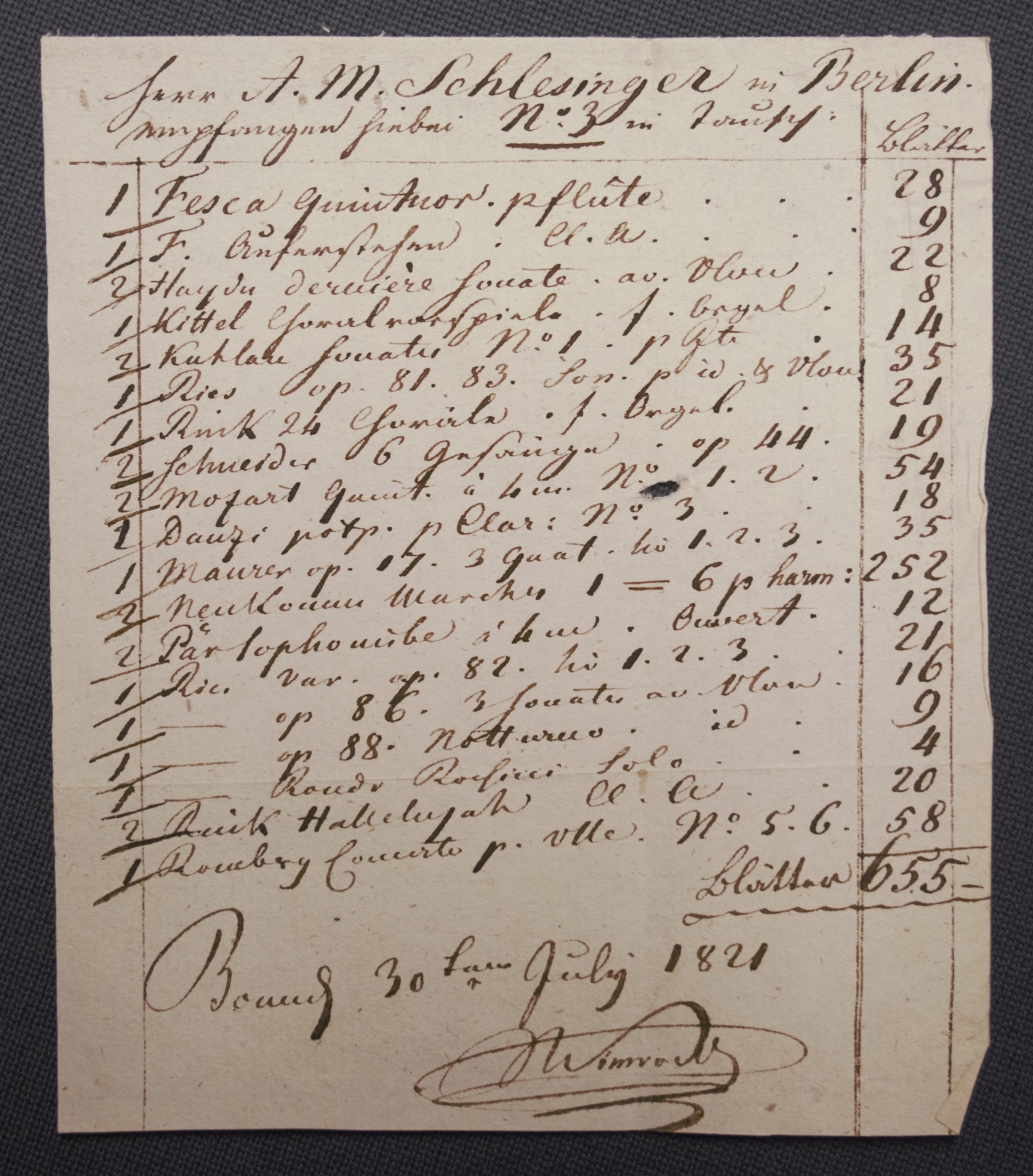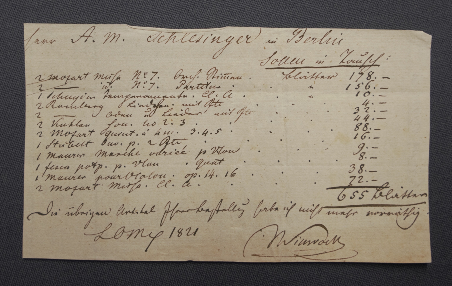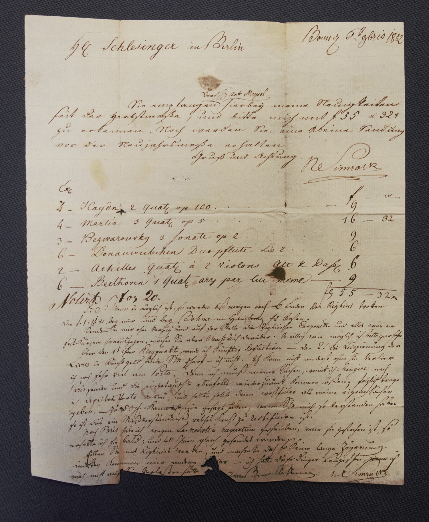 Schlesinger, Adolph Martin (ursprünglich Abraham Marcus), bedeutender Berliner Buch- und Musikalienhändler, Verleger Webers, Beethovens und anderer großer Komponisten seiner Zeit (1769-1838). Teil seiner Geschäftskorrespondenz, bestehend vorwiegend aus Briefen, ferner Abrechnungen, Preis- und Lieferlisten sowie anderen Schriftstücken, fast immer an Adolph Schlesinger gerichtet. Circa 73 Bl. Verschied. Formate. 1797-1834.