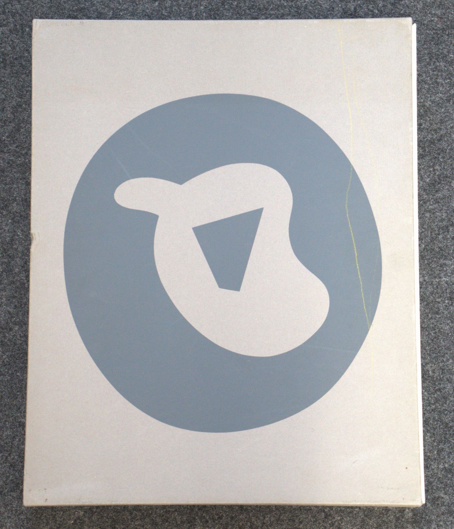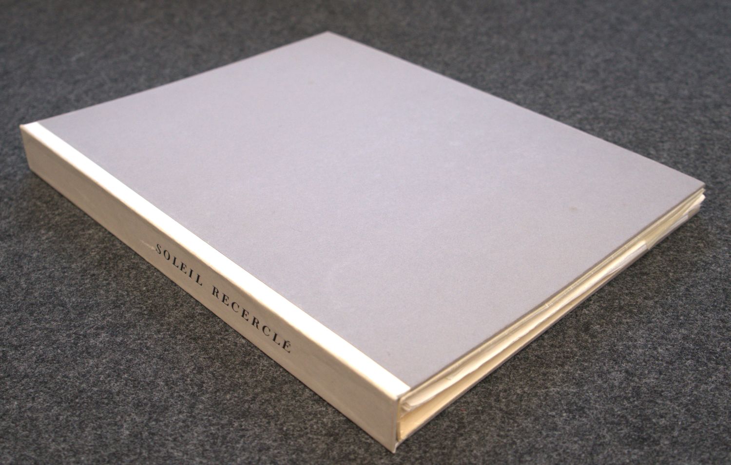 Arp, Jean. Soleil recerclé. 64 S., 6 Bl. Mit 19 (14 blattgroß, 1 signiert und nummeriert) Orig.-Farbholzschnitten, davon einer auf dem Umschlag und einer auf dem Schuber wiederholt. 48 x 37 cm. Lose Bogen in Originalumschlag und OHalbpergamentchemise, zusammen in illustriertem OPappschuber. Paris, Louis Broder, 1966.