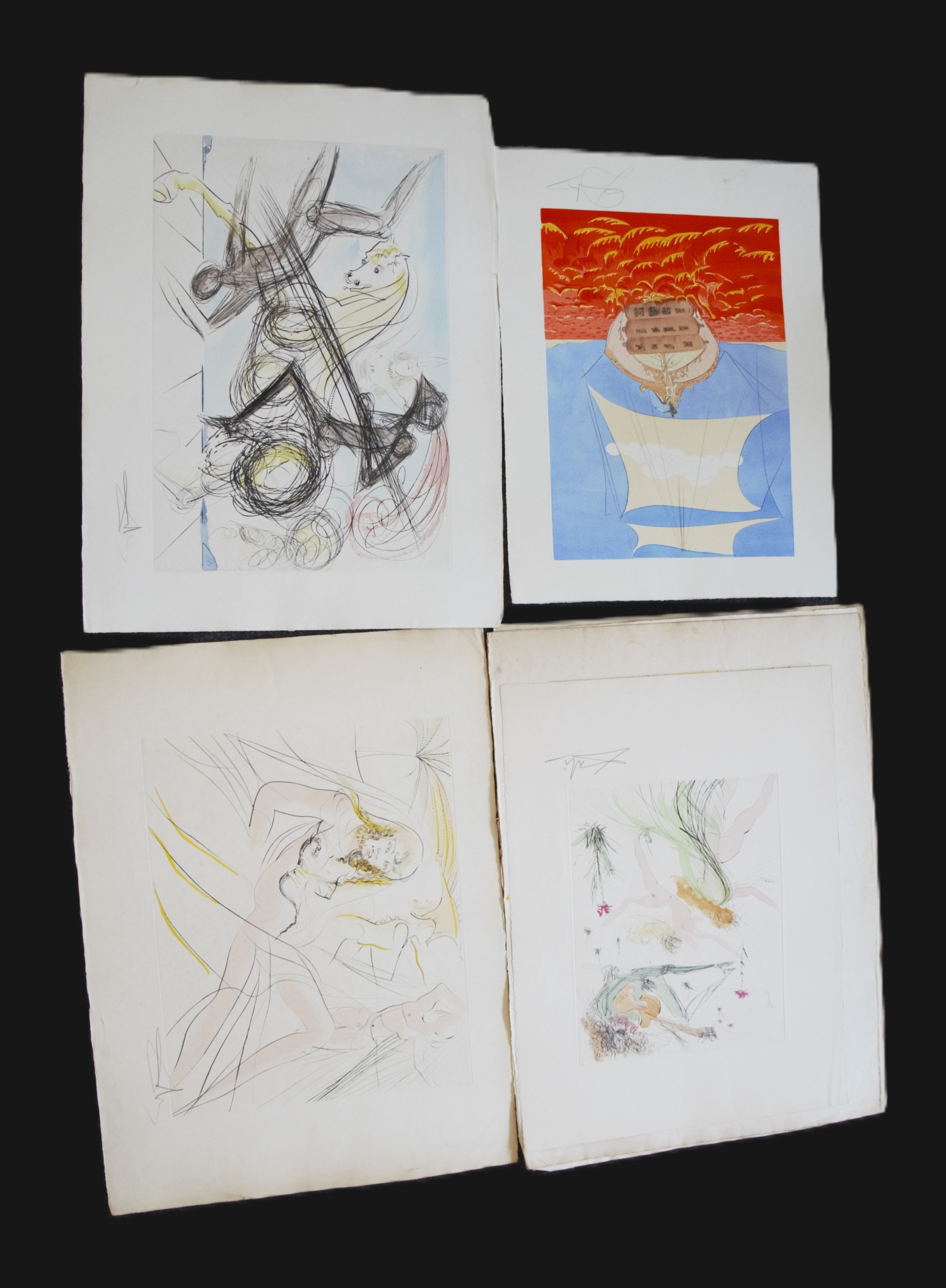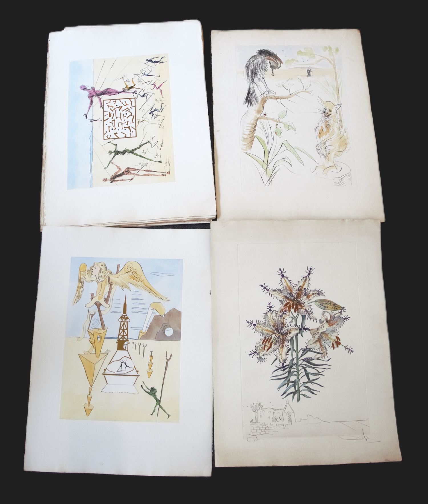 Die Graphiken zeigen unterschiedliche abstrakte Szenerien in kräftigen Farben, teilweise mit bekannten Motiven, wie der zerlaufenden Uhr oder der Erzengel Michael. – Vereinzelt mit kleineren Fehlstellen am Rand, Randläsionen und kleinen Gebrauchsspuren. Alle signiert, jedoch teilweise nicht vom Künstler.