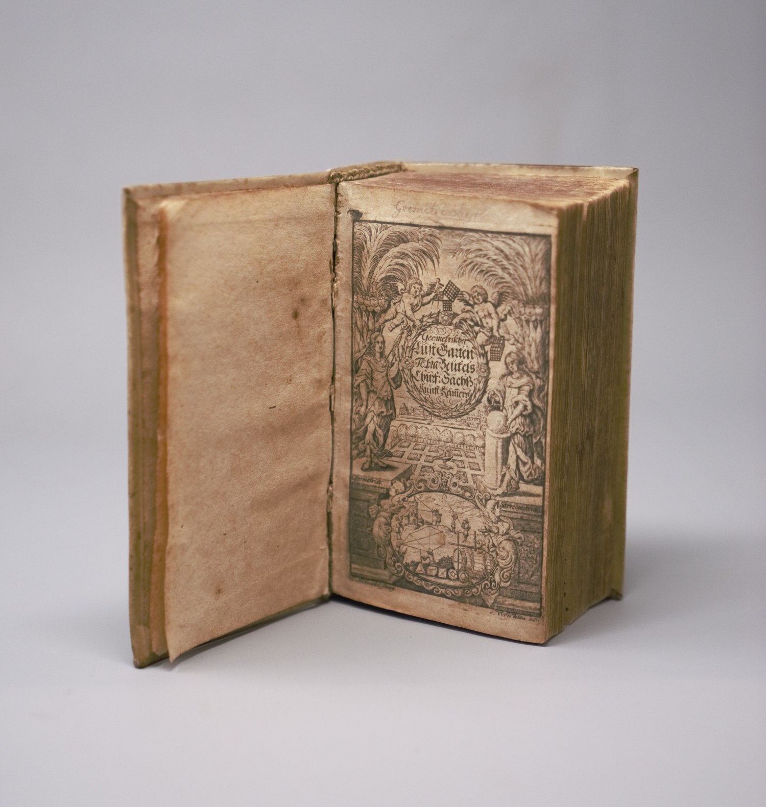 Beutel, Tobias. Anderweit ... Geometrischer Lust-Garten [und:] Angelegte ... Geometrische Gallerie. 2 Teile in 1 Band. 12 Bl., 499 S., 1 Bl.; 323 S. Mit gestochenem Frontispiz und zahlreichen schematischen Textholzschnitten. Titel in Rot und Schwarz. 13 x 7,5 cm. Pergament d. Z. (leicht berieben, fleckig und ohne die Verschlussbändchen) mit hs. RTitel. (Leipzig, Johann Georg für Johann Christoph Tarnovius, 1698).