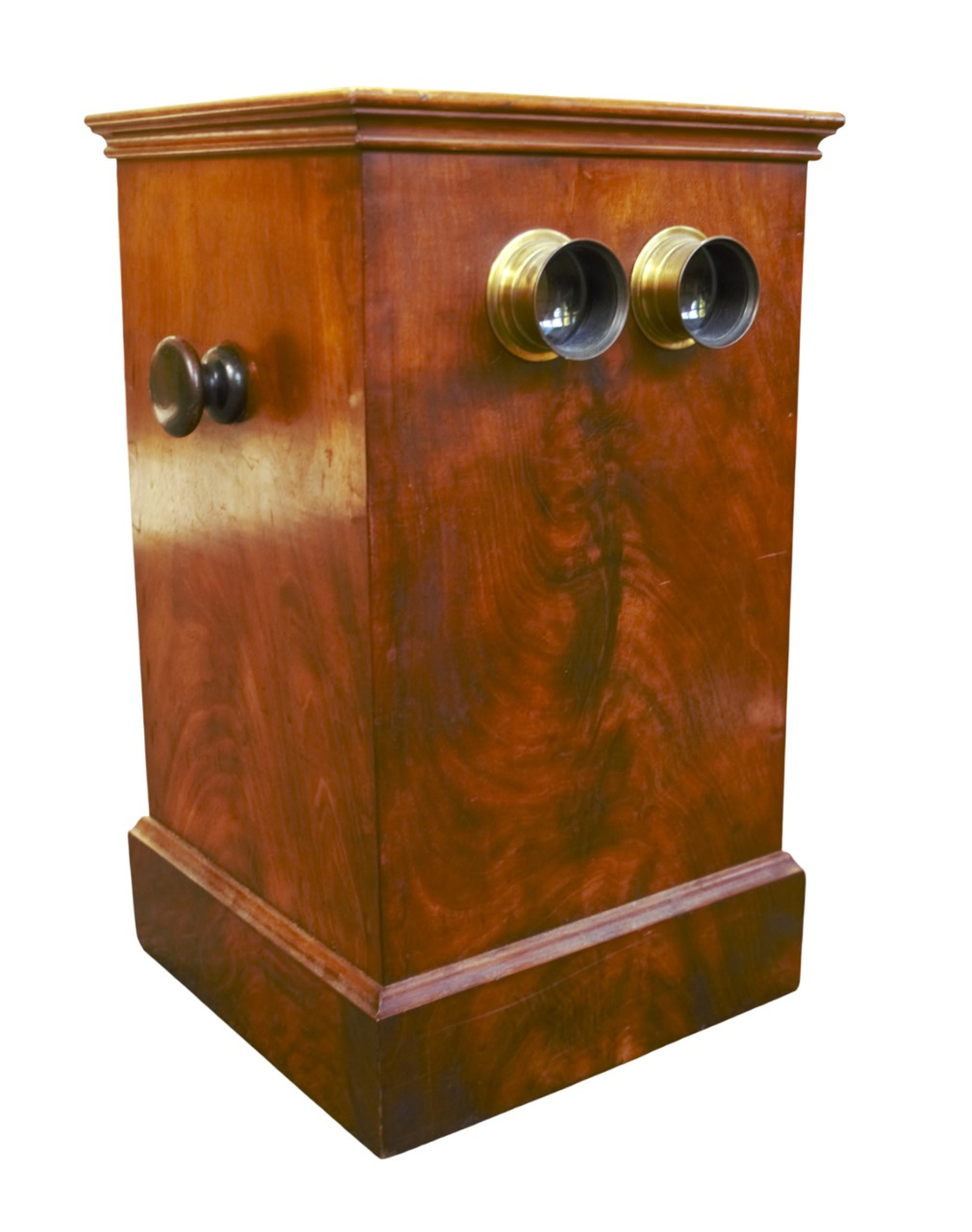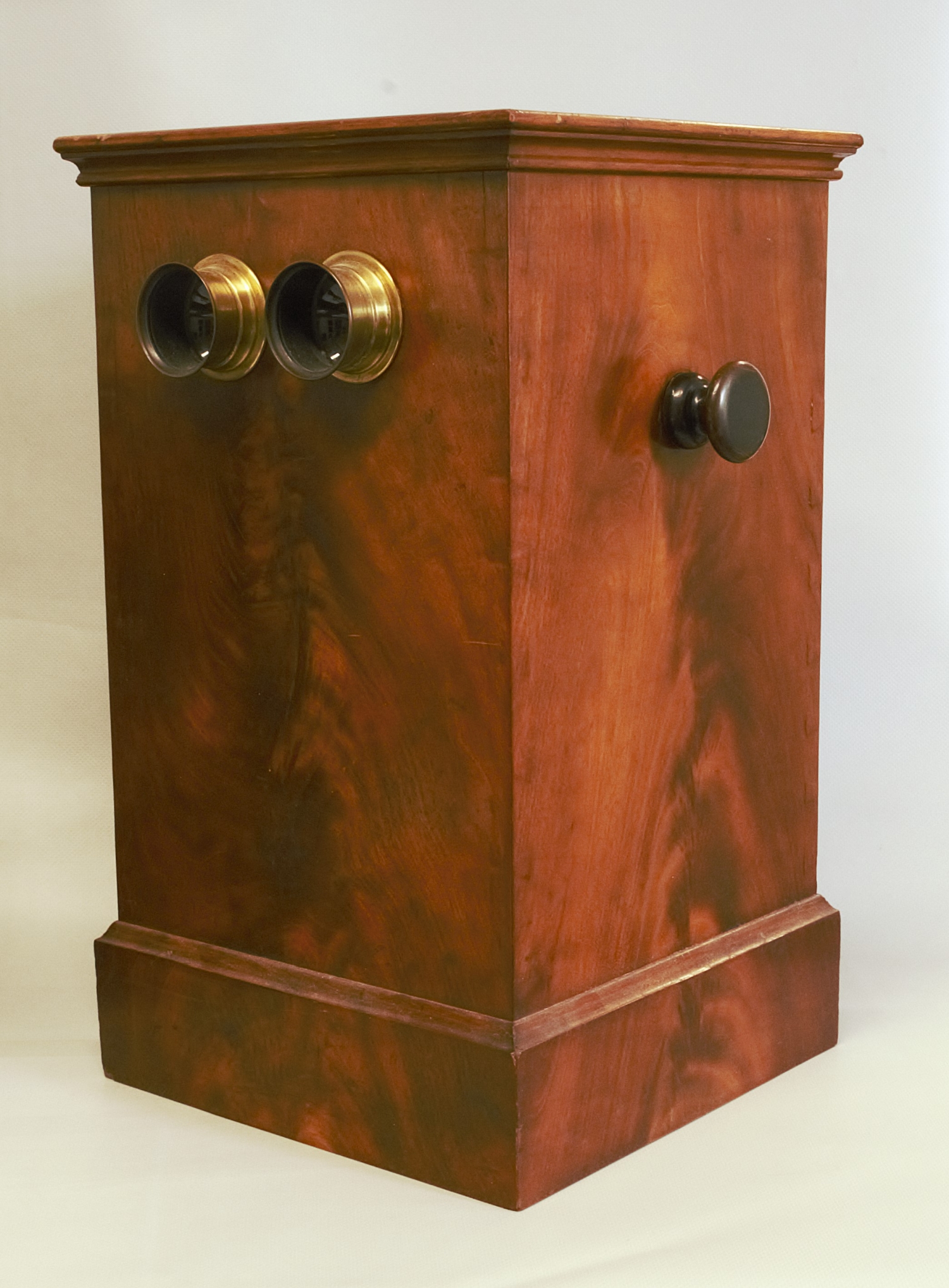 Edler Tisch-Stereobetrachter in kastenförmigem Gehäuse aus dunkel gebeiztem Nussbaumholz. Die Vorderseite ist mit zwei Okularen in Metallfassungen ausgestattet, durch die stereoskopische Glasdiapositive betrachtet werden können.