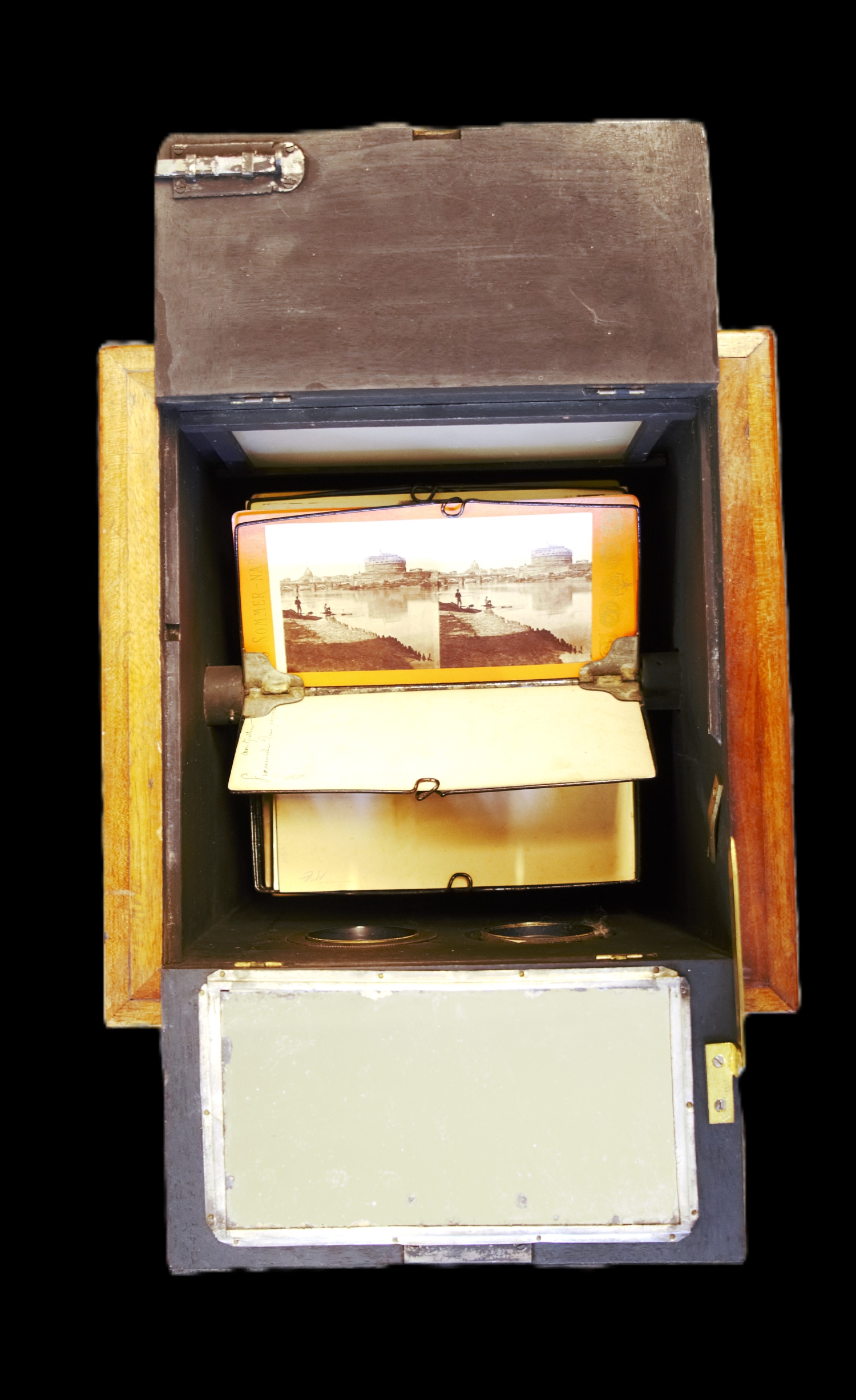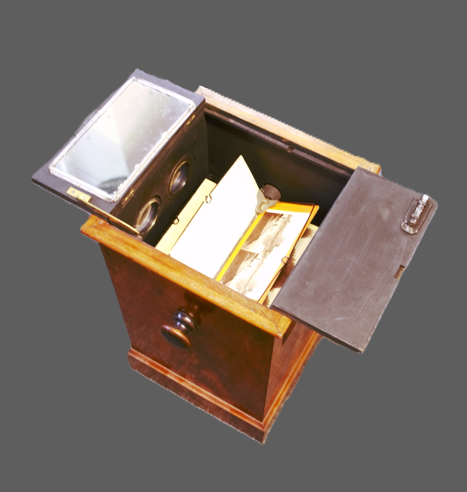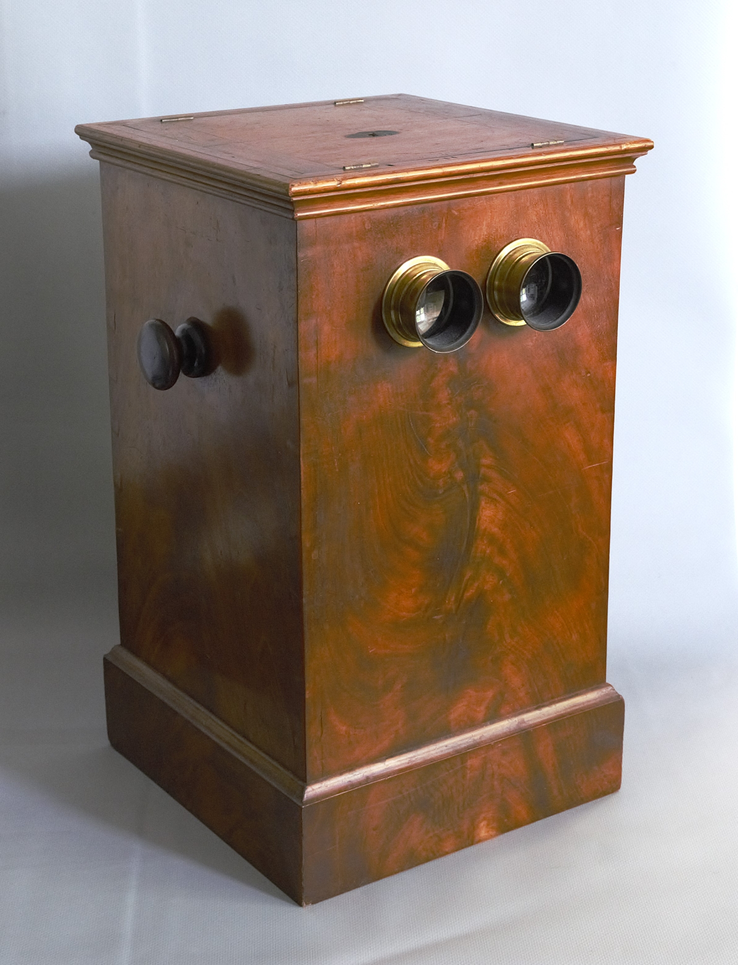 "Le Taxiphote"- Tisch-Stereobetrachter mit Nussbaumkorpus mit zwei Okularen in Metalleinfassungen, verso eine verglaste Klappe zur Einlage der Bildvorlagen, seitlich ein Kurbel-Drehknopf zur Justierung, oben klappbarer Deckel mit Scharnieren. Das Magazin ist im Inneren mit zahlreichen Stereo-Bildpaaren historischer Städteansichten gefüllt. Höhe: 44 cm, Länge: 26 cm, Breite: 26 cm. Wohl Deutschland, um 1910.