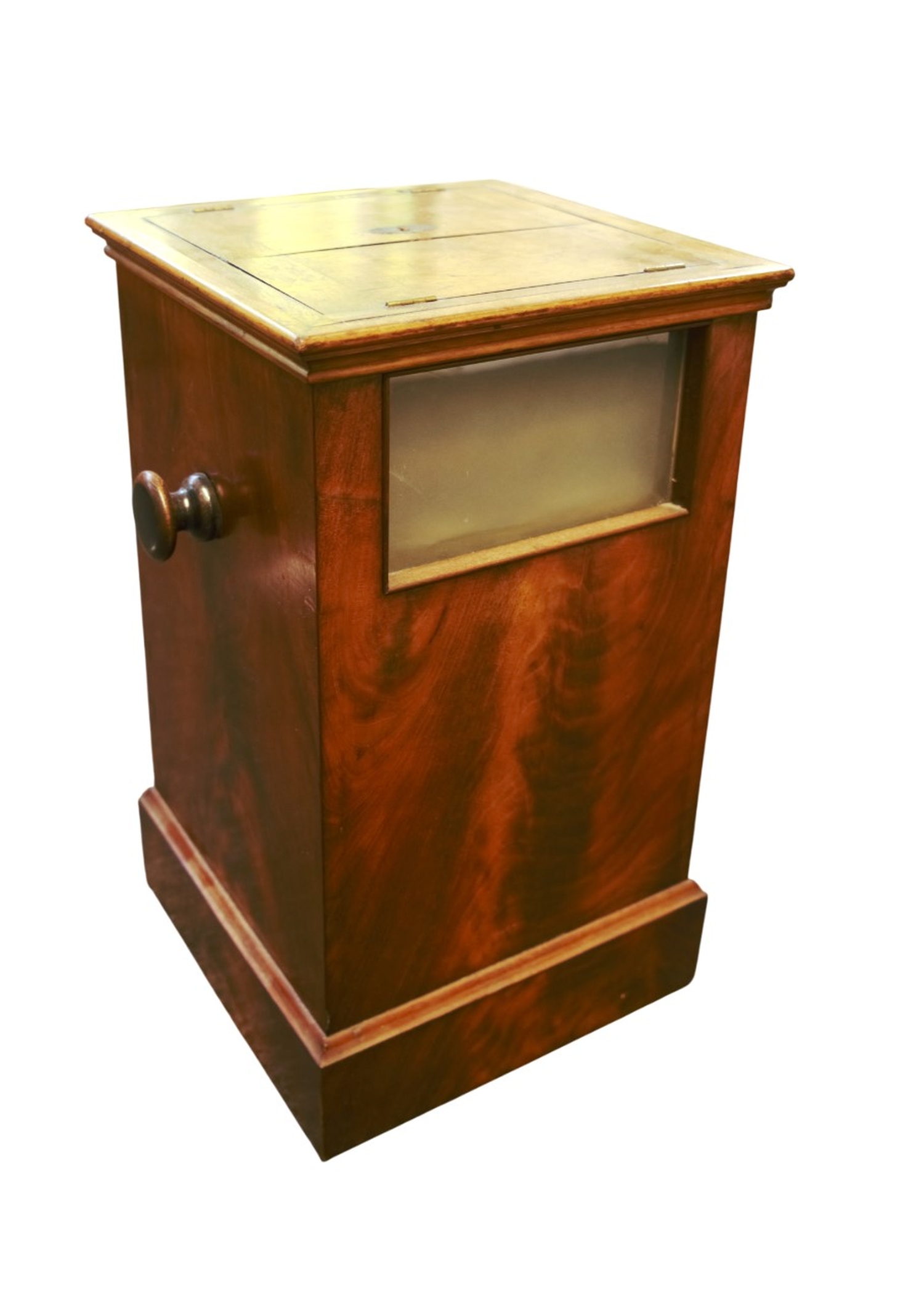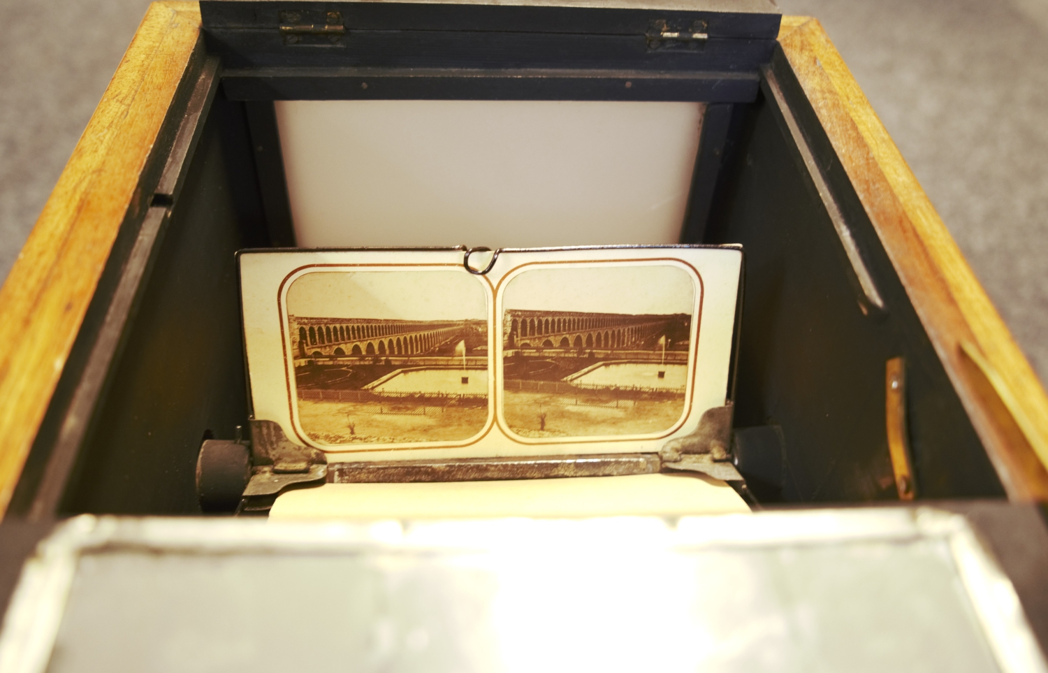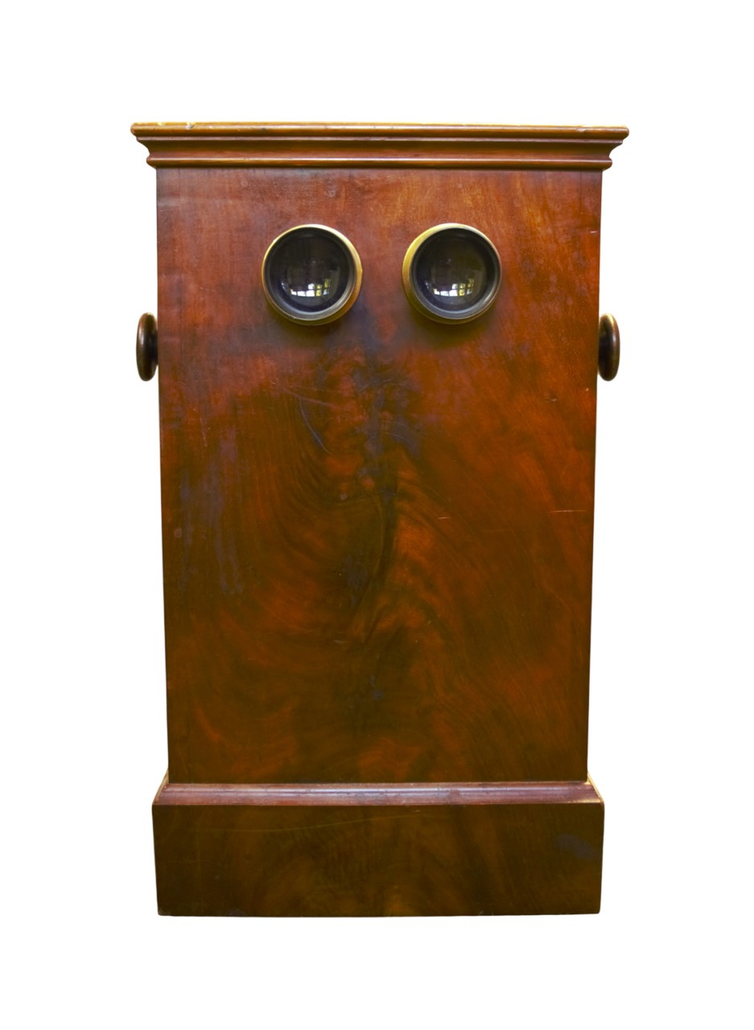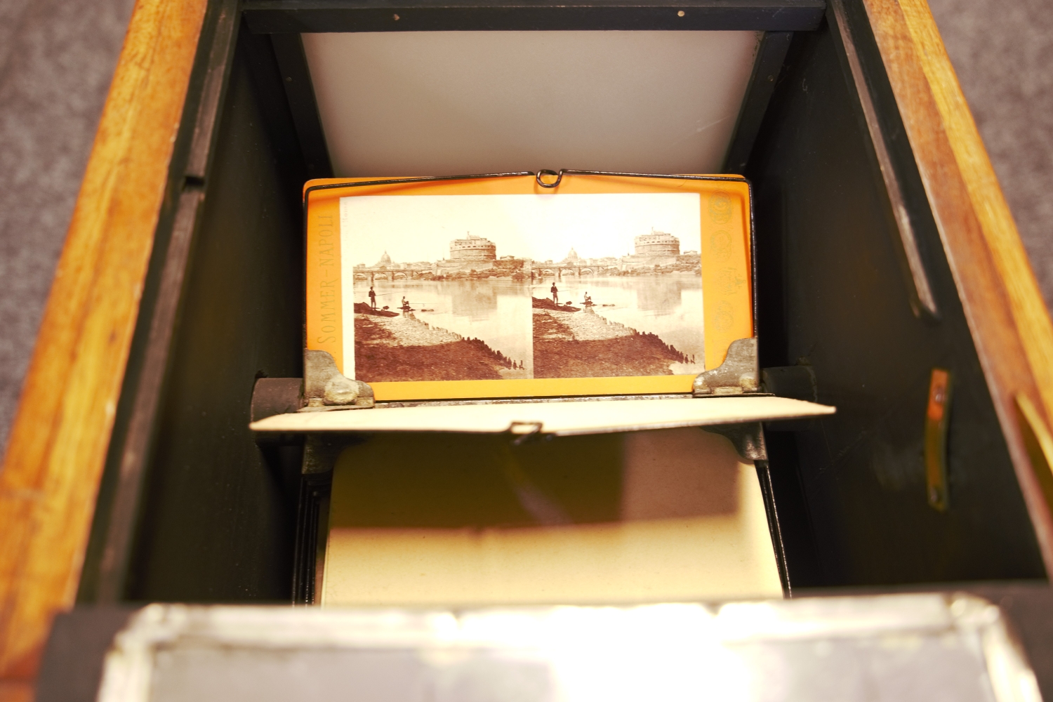 "Le Taxiphote"- Tisch-Stereobetrachter mit Nussbaumkorpus mit zwei Okularen in Metalleinfassungen, verso eine verglaste Klappe zur Einlage der Bildvorlagen, seitlich ein Kurbel-Drehknopf zur Justierung, oben klappbarer Deckel mit Scharnieren. Das Magazin ist im Inneren mit zahlreichen Stereo-Bildpaaren historischer Städteansichten gefüllt. Höhe: 44 cm, Länge: 26 cm, Breite: 26 cm. Wohl Deutschland, um 1910.