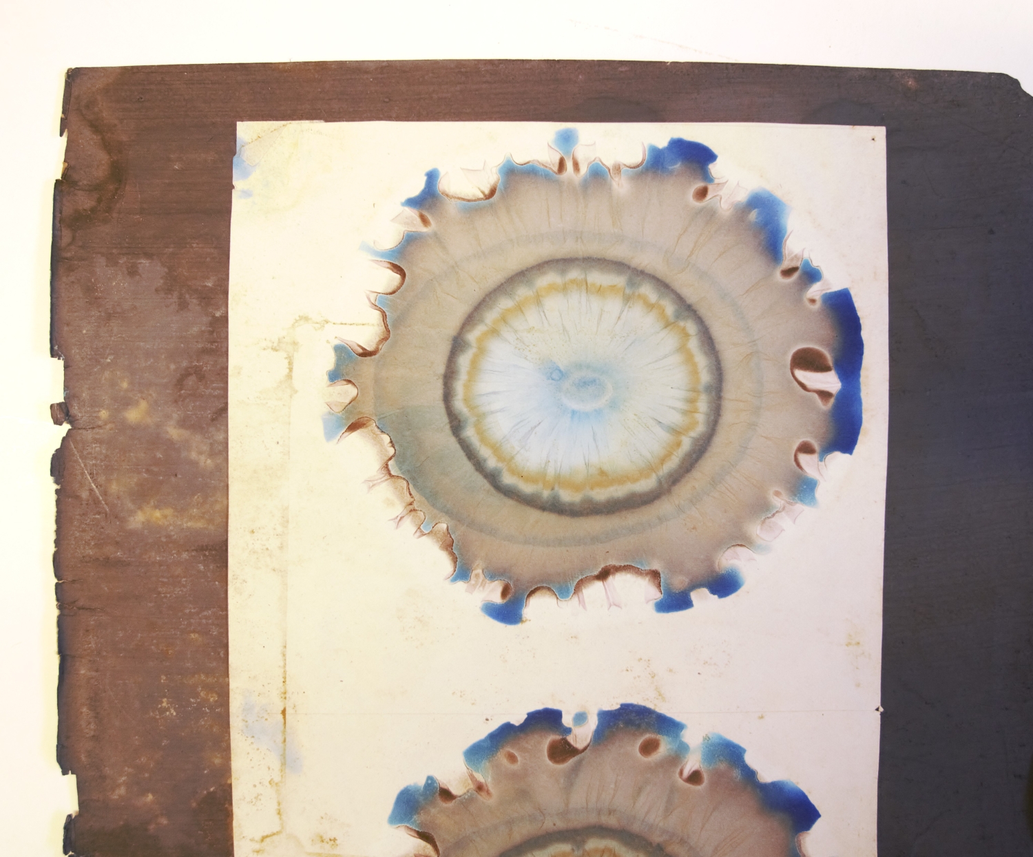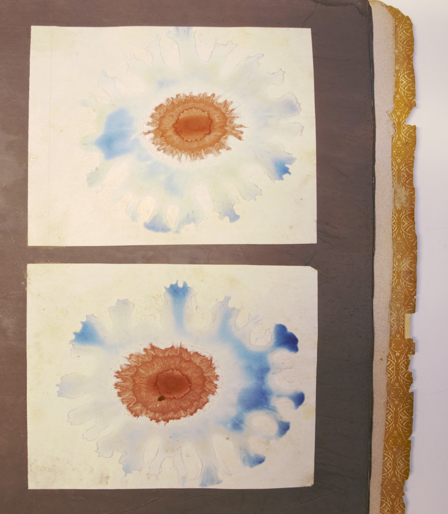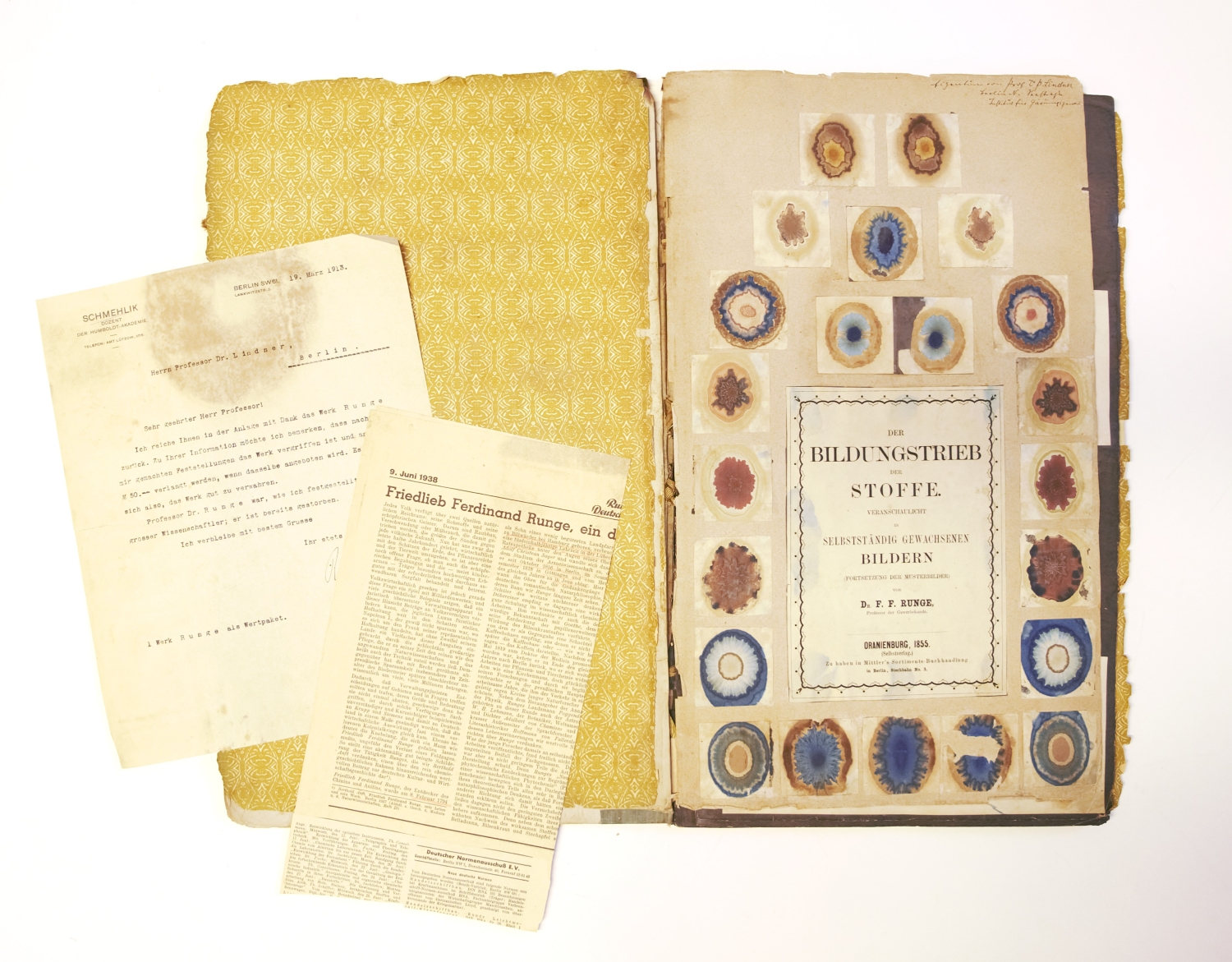 Poggendorff II, 722. DSBXI, 616. – Erste Ausgabe der bereits 1822 eingereichten und 1855 im Druck erschienenen Dissertation des aus Hamburg-Bergedorf stammenden und die letzten Lebensjahrzehnte in Oranienburg wirkenden Chemikers und Mediziners Friedrich Ferdinand Runge (1794-1867). Bei seinen hier vorliegenden Experimenten mit der Verteilung von Farbstoffen auf saugfähigem Papier, sogenannten Ringchromatographien, handelt es sich um die wissenschaftliche Erstbeschreibung derartiger Phänomene. Bemerkenswerte Darstellung chemischer Reaktionen, durch die Runge zum Vorläufer der Selbstorganisationstheorie der Natur wurde. Verschiedene chemische Verbindungen aus Salzen, Metallen, Säuren etc. bilden, im flüssigen Zustand auf saugfähiges Papier gebracht, verschiedene kreisförmige Muster. Diese hier zusammen mit den gedruckten Erklärungen (Nummer 1-32 und Schlussbemerkung) auf gestrichenes Papier montiert. Die Nummern 1 bis 5 mit je 1, die Nummern 6 bis 30 mit je 2, die Nummern 31 und 32 mit je 3 montierten Farbmustern. Ein moderner Reprint erschien 2014 in der von Judith Schalansky herausgegebenen Reihe der "Naturkunden" im Berliner Verlag Matthes und Seitz: "Schwebende, organische Farbtriebe wandern über das Papier, erblühen zu berauschenden psychedelischen Mustern in erstaunlich intensiven Tönen" (Verlagswerbung). – Exemplar mit deutlichen Erhaltungsmängeln: Alle Tafeln aus der Bindung gelöst, mit kleineren Randläsuren und durchgehend mal mehr, mal weniger fleckig sowie mit unterschiedlich stark ausgeprägten Feuchtigkeitsrändern. Die Farbmuster allerdings nur teilweise betroffen, diese teils etwas verblasst, gelöst oder lose. Titel papierbeding gebräunt, eine der dort montierten 22 kleinen Farbmuster mit Fehlstelle. Exemplar aus dem Besitz des Mikrobiologen und Robert Koch-Schülers Paul Lindner (1861-1945), langjähriger Leiter der Abteilung für Reinkultur am Institut für Gärungsgewerbe und Stärkefabrikation der Landwirtschaftlichen Hochschule Berlin, mit dessen Besitzeintrag auf dem Titel. Lose beiliegend ein maschinenschriftliches Begleitschreiben eines Berliner Kollegen namens Schmehlik vom 19. März 1913, der das Exemplar ausgeliehen hatte und nun zurückgibt, mit einem Hinweis auf die schon damals bekannte Seltenheit ("Es empfiehlt sich, das Werk gut zu verwahren"). - Sehr selten.