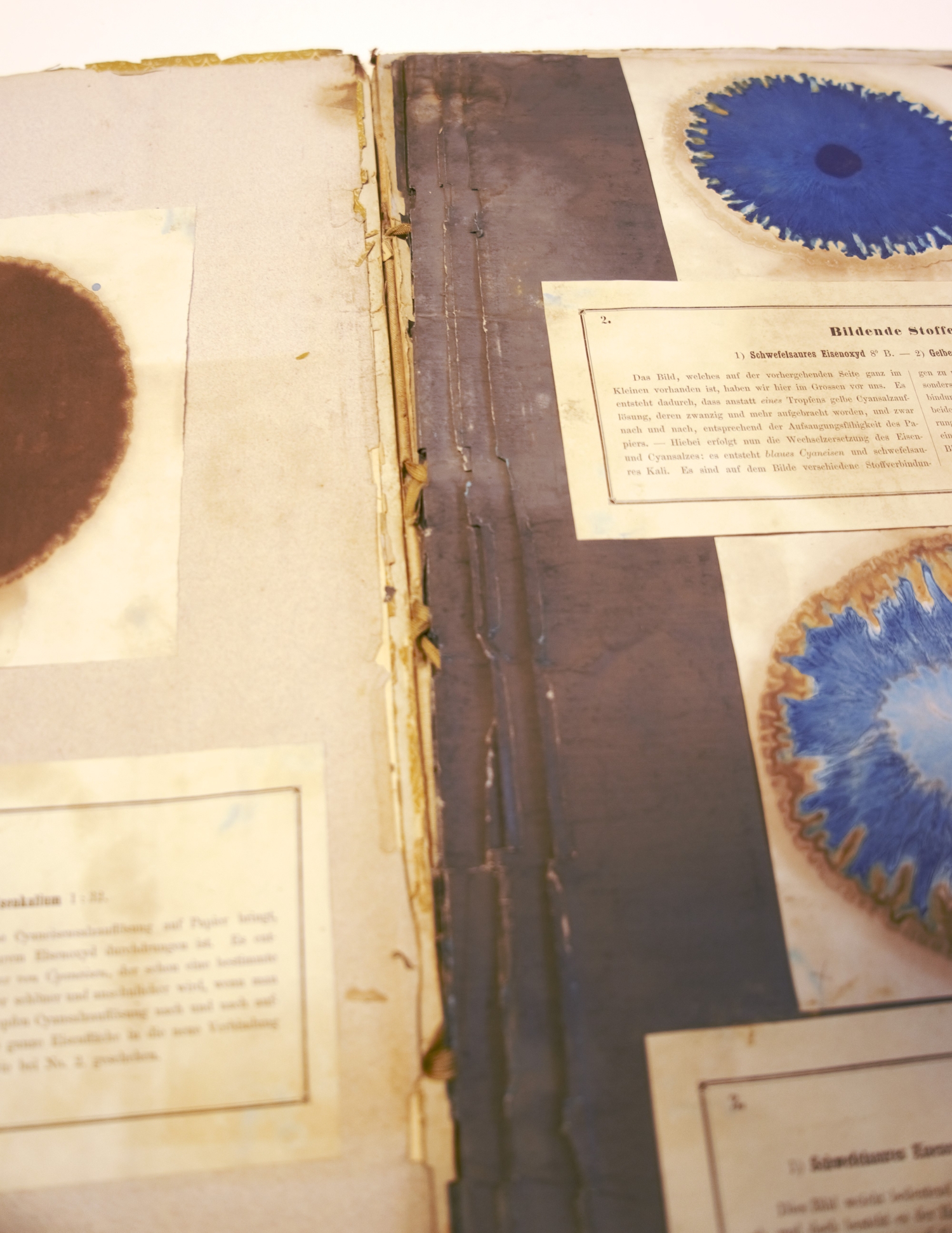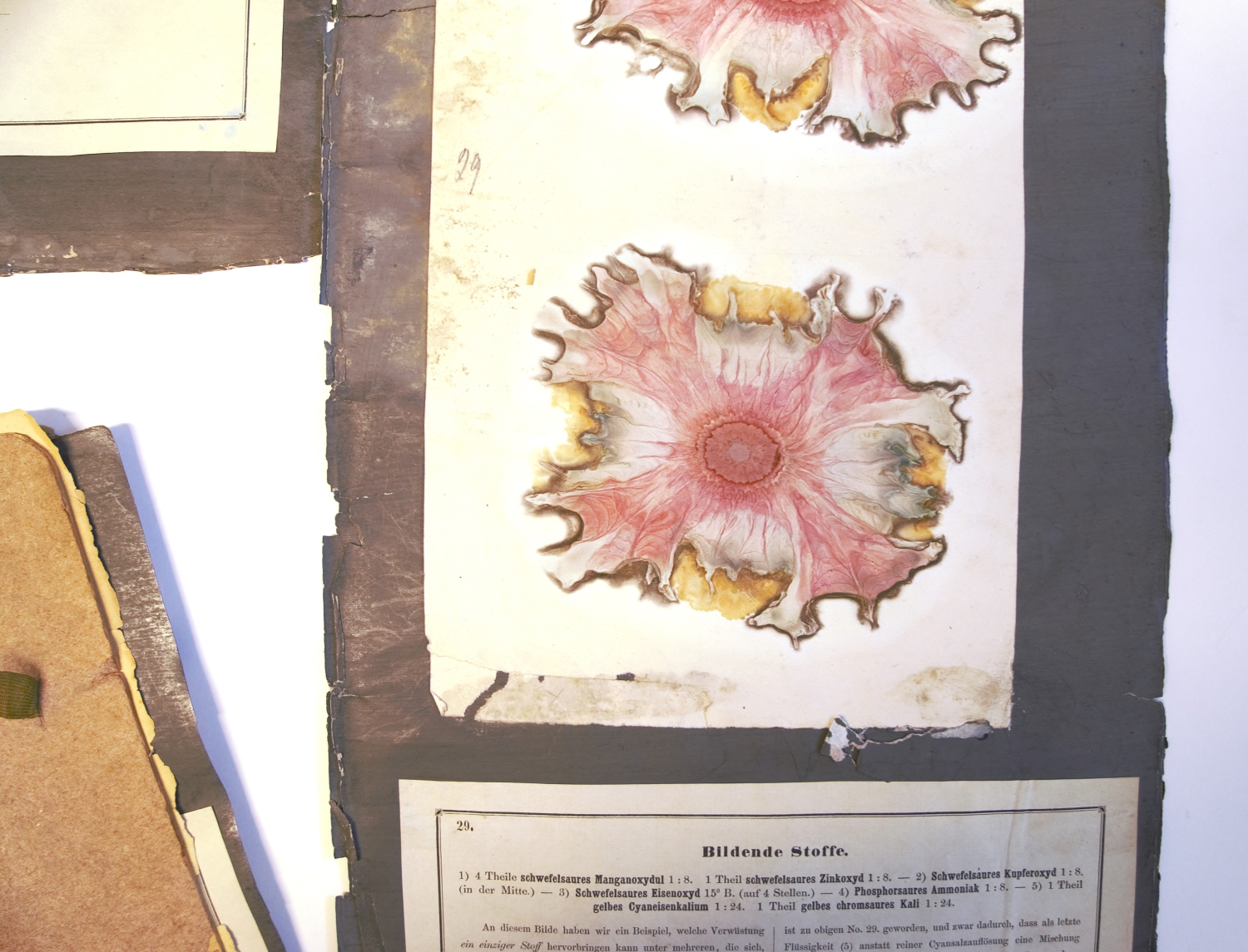 Runge, F(riedrich) F(erdinand). Der Bildungstrieb der Stoffe. Veranschaulicht in selbständig gewachsenen Bildern (Fortsetzung der Musterbilder). 30 Bl. Mit 22 kleinen (auf dem Titel) und 61 größeren (auf den Tafeln) montierten Orig.-Farbmustern. 42,5 x 25,5 cm. Lose Blatt in Halbleinen-Mappe d. Z. (stärkere Gebrauchsspuren). Oranienburg, Selbstverlag, 1855.