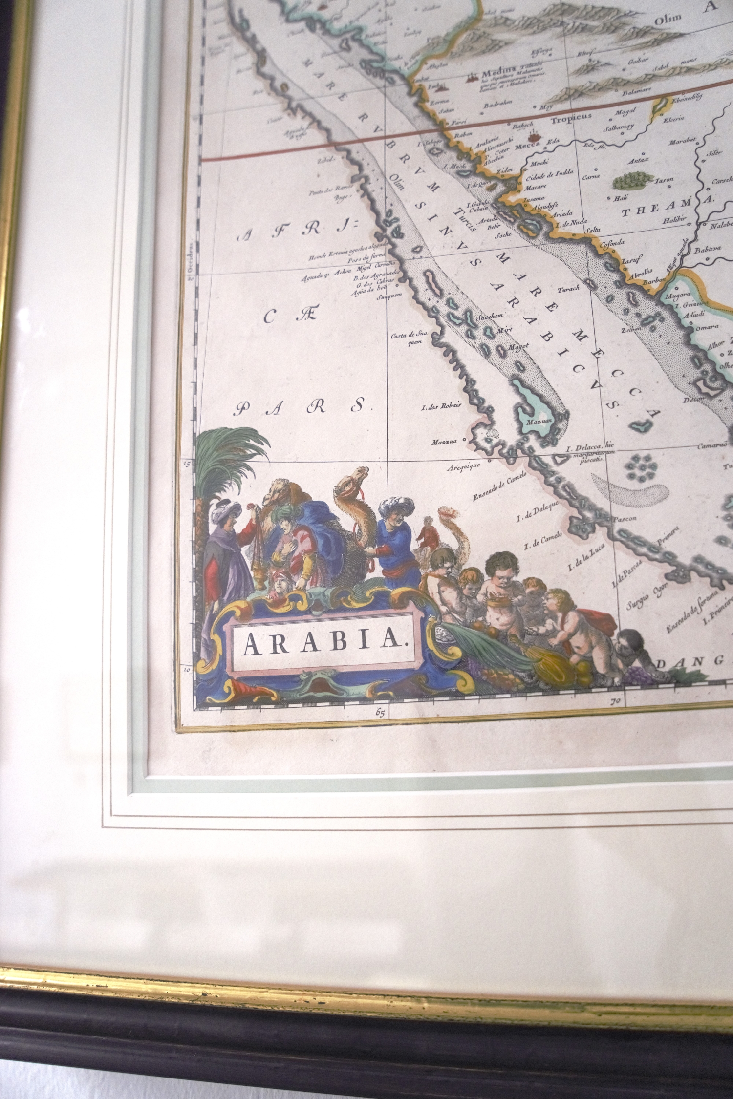 Blaeu, Johannes. Arabia. Kolorierte Kupferkarte. 41,5 x 52 cm (Plattenrand). Unter Glas mit Passepartout in goldgeprägter Holzprofilleiste. Amsterdam 1661.