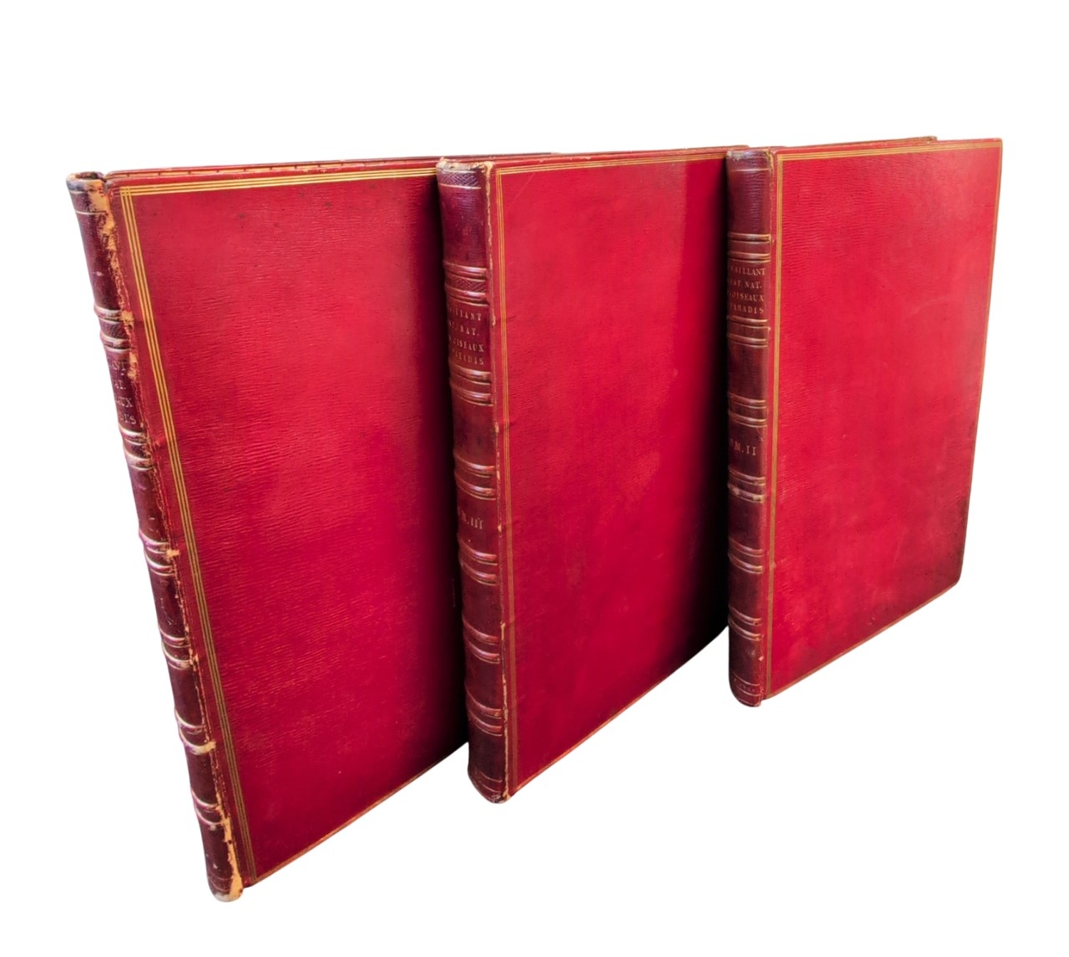 Levaillant, François. Histoire naturelle des oiseaux de paradis et des Rolliers, suivie de celle de Toucans et des Barbus [bzw:] Histoire naturelle des promerops, et des guepiers, faisant suite à 'celle des oiseaux de Paradis. 3 Bände. Mit zusammen 197 (3 doppelblattgroßen bzw. gefalteten) kolorierten Kupfertafeln, gestochen von Perée und Gremilliet nach Jacques Barraband und Auguste, in Farben gedruckt von Langlois, Rousset und Millevoy mit zusätzlichem Handkolorit, teils mit Eiweiß, teils mit Gold gehöht, Tafeln auf festem Papier. Imperialfolio 51,4 x 32,7 cm. Rotes quergenarbtes Chagrin-Maroquin d. Z. (lediglich an den Kanten und Gelenken ganz gering beschabt, berieben und leicht bestoßen) auf 6 Doppelbünden mit goldgeprägtem RTitel, Blindprägung und Goldfileten, Deckel mit dreifacher goldgeprägter Fileteneinfassung, Stehkantenrifeln, goldgeprägten Innenkantenmäandern um blau-grau-rot-marmorierte Vorsatzpapiere und dreiseitigem Goldschnitt. Paris, Denné & Perlet (1801-)1806 und Denné le jeune (1806-) 1807(-1816 oder 1818).