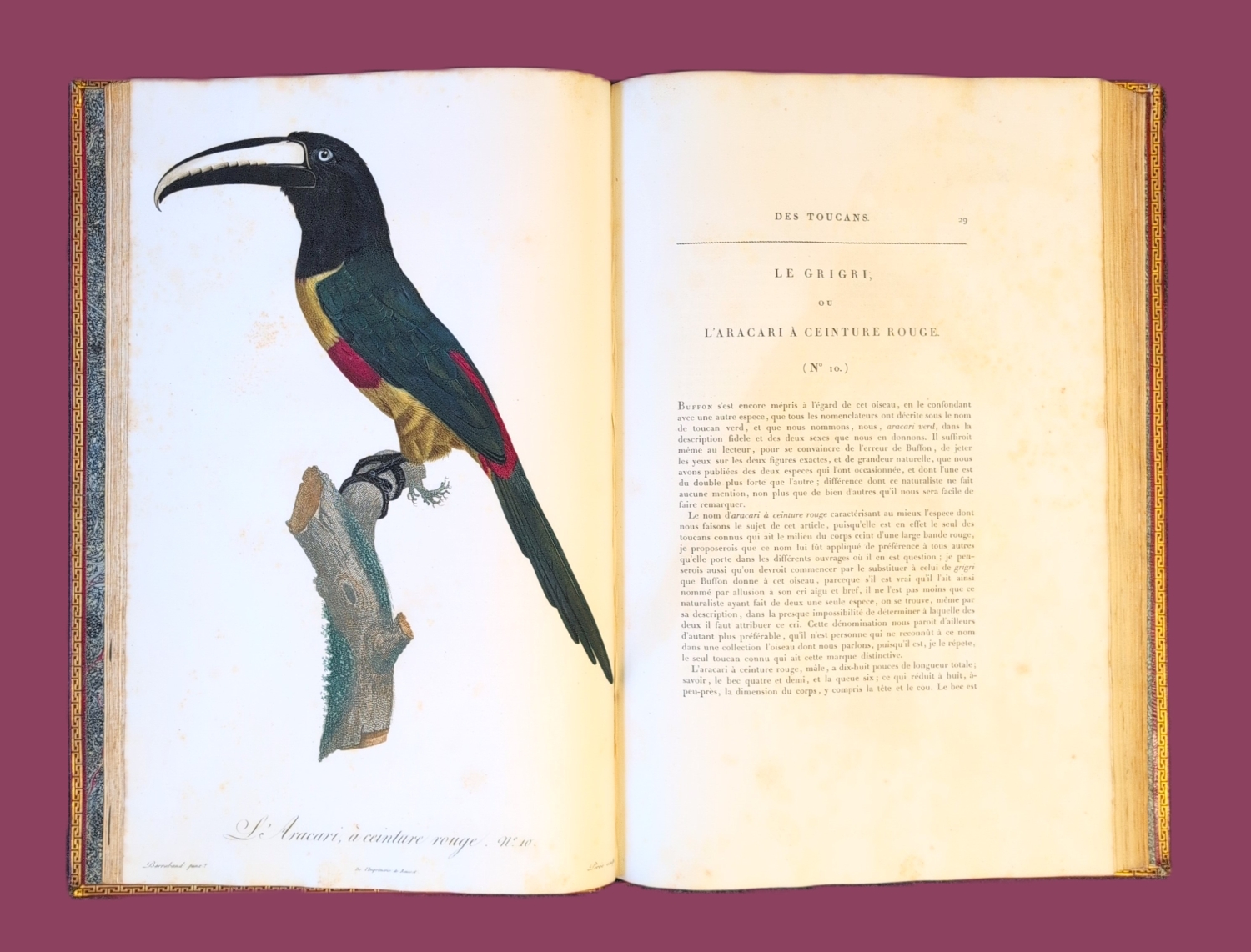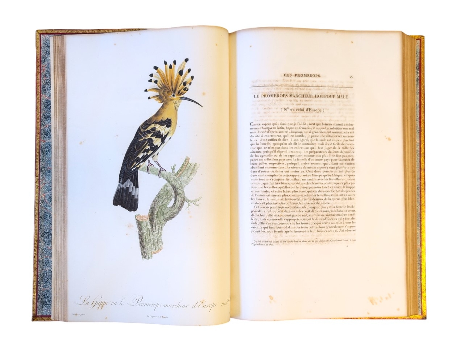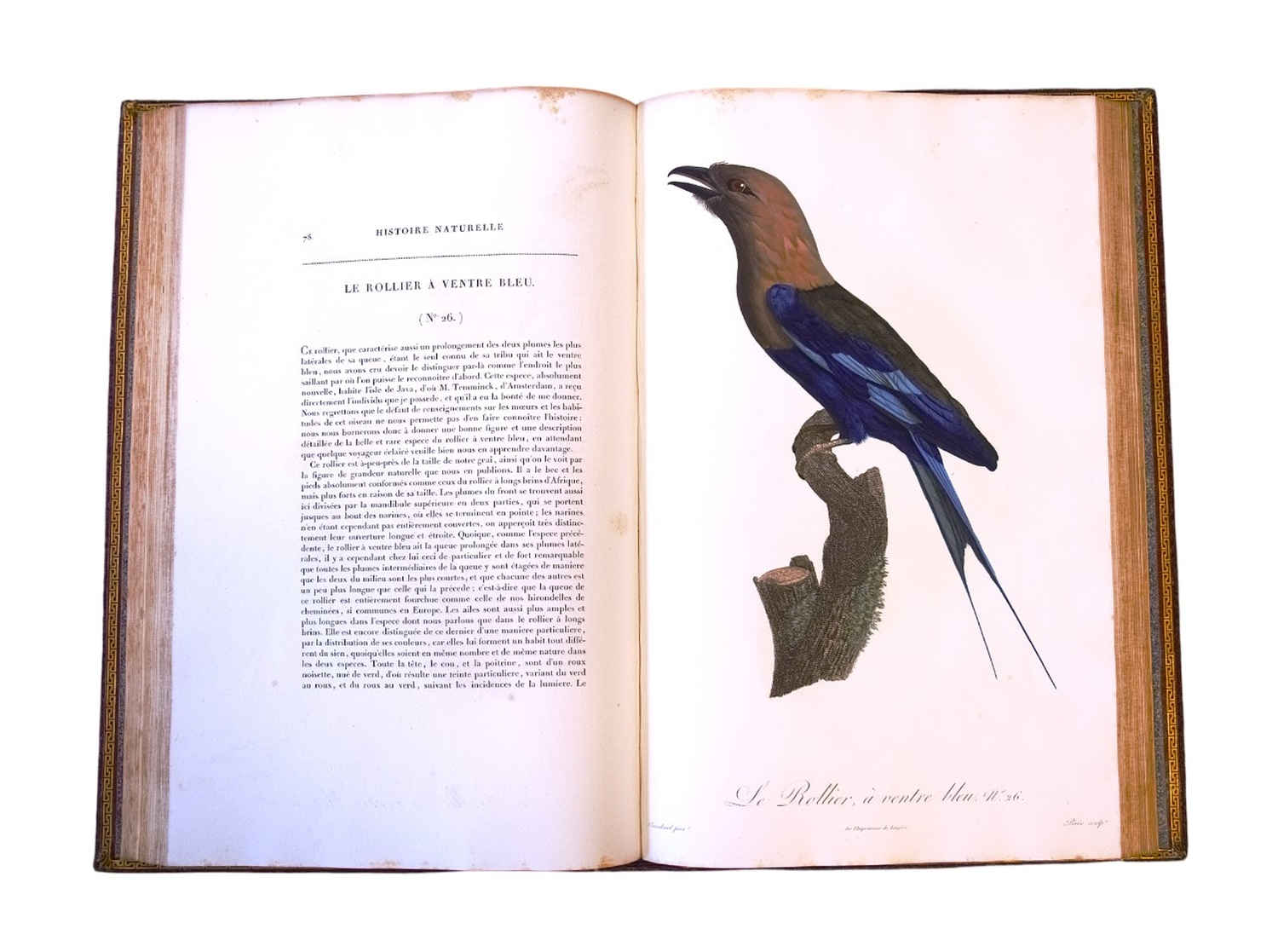 Die insgesamt 197 Kupfertafeln (die größte mißt ca. 81 x 51,4 cm!) stammen hauptsächlich von dem wohl bedeutendsten Vogelmaler der Zeit Jacques Barraband, der auch für die Porzellanmanufaktur von Sèvres und die Gobelinmanufaktur als Zeichner tätig war und 1807 als Professor der Blumenmalerei nach Lyon ging. Barraband war es auch, der die Dekorationen füir Napoleons Speisezimmer im Château St. Cloud schuf. Das Werk ist, zusammen mit den "Perroquets" des Verfassers, einer der Höhepunkte des französischen Farbstichs der Napoleonischen Ära, in der die Publikation von Prachtwerken der Ornithologie und Botanik durch das Herrscherhaus gefordert wurde, die als repräsentative Geschenke für gekrönte Häupter und wissenschaftliche Institutionen dienten. Über ca. 18 Jahre hinweg erschien das Werk in Lieferungen, was einige Ungenauigkeiten in der Kollation und der Tafelzählung erklärt. Das vorliegende Exemplar stimmt jedenfalls mit der bei Anker gegebenen Kollation überein.