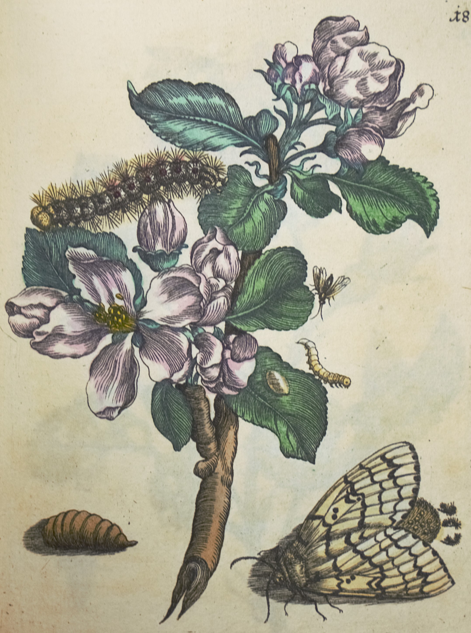 Nissen, BBI 1342. Landwehr, Dutch Books with Coloured Plates, 135. Pfeiffer A 7. Wettengl Kat. Nr. 155. – Erste lateinische Gesamtausgabe aller 3 Teile (hier lediglich wie oft bei Zusammenbindung ohne das Frontispiz von Schnyvoet und die beiden Titelkupfer zu Teil II und III). Abgebildet sind verschiedene Schmetterlinge, Raupen und andere Insekten mit deren pflanzlicher Nahrung. Da die Raupen und Schmetterlinge auf den Pflanzen bzw. Blumen dargestellt sind, auf denen sie leben, gehört das Werk der Sib. Merian zugleich zu den schönsten Pflanzenbüchern ihrer Zeit. "Vom rein künstlerischen Standpunkt enthalten ihre Werke die weitaus besten Schmetterlings-Darstellungen, welche bis dahin erschienen waren. Sie hat es verstanden ihren Werken als Buchschöpferin eine Form zu geben, welche dieselben unter die schönsten und eindrucksvollsten Veröffentlichungen aller Zeiten einreiht, so daß sie noch heute das Entzücken aller Bücherliebhaber und aller Liebhaber der Natur bilden ... " (Pfeiffer).
