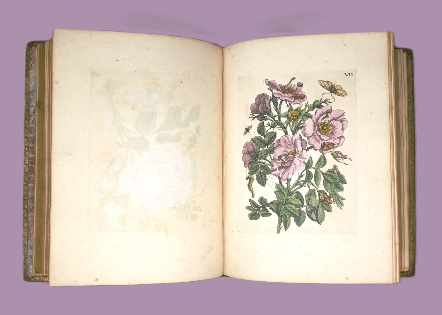 Bei dem Portrait und dem Titelkupfer im vorliegenden Exemplar handelt es sich um Umdrucke. Sie weisen die bei E. Rücker (M. S. Merian, 1967) hierfür genannten Merkmale auf (S. 15): sie haben zarte Linien, keinen Plattenrand und sind seitenverkehrt, da bei dem Umdruckverfahren ein Druck vom druckfrischen Papier als Abklatsch abgenommen wird. Diese Form des Umdrucks war ein von M. S. Merian geschätztes Verfahren, welches sie nur bei den wenigen Exemplaren benutzte, die sie selbst kolorierte. "Begreiflicherweise ist die Anzahl der Umdruckexemplare gering. Beim Raupenbuch sind sie eine solche Ausnahme, daß die gesamte Merian-Literatur davon gar nicht Kenntnis nimmt" (Rücker S. 15). Es handelt sich hier also um eines jener wenigen Vorzugsexemplare, das von Maria Sibylla Merian oder ihren Töchtern - da sie schon 1717, also ein Jahr vor Drucklegung - koloriert wurde. E. Rücker beschreibt nur ein vollständiges Exemplar des Raupenbuches mit Umdrucken; nämlich das der Stadtbibliothek Frankfurt, in dem wohl alle 150 Kupferstiche im Umdruckverfahren hergestellt sind (Rücker S. 15). – Auf dem weißen Vorsatzblatt ist folgende Eintragung aus dem 18. Jahrhundert zu finden: "Det is een origineel Exemplaer van de Authuer. Self afgeset, extra Raar en Seer Suijver". - Wir wollen diesem Kommentar des möglichen Erstbesitzers nichts hinzufügen.