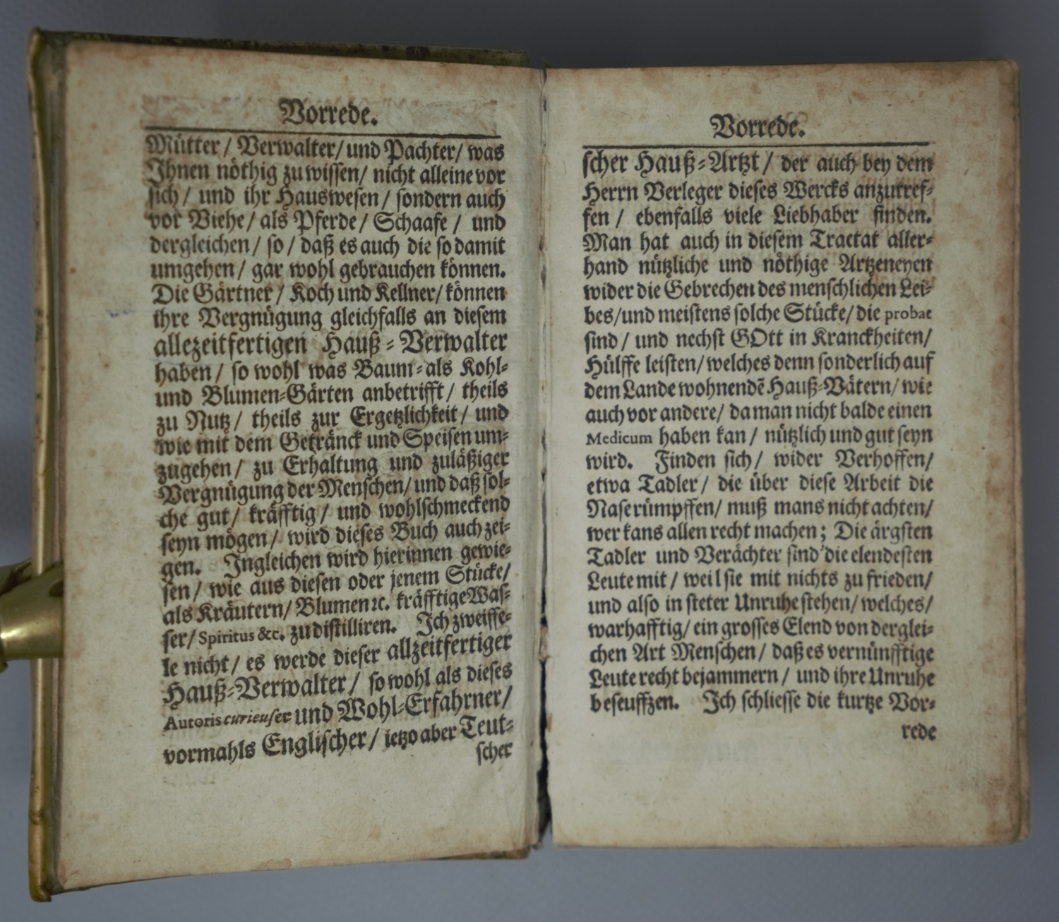 Hellwig, Christoph von (Pseud.:) Caspar Schröter. Allzeitfertiger Hauß-Verwalter, Worinnen ein Garten- Koch- Condir- und Distillir- Wie auch Artzeney-Buch. Allen Hauß-Vätern, Hauß-Müttern, Verwaltern, Pachtern, Gärtnern, Köchen ... mit sonderbahren Fleiß, auch feinen Figuren, Vorrede und Registern ausgefertiget. 6 Bl., 360 S., 1 Bl., 128, 105 S., 22 Bl., 16 S. Mit Holzschnitt-Tafel und einigen Textholzschnitten. 16,5 x 10 cm. Pergament d. Z. (stärker fleckig) mit hs. RSchild und spanischen Kanten. Frankfurt und Leipzig, Hieronymus Philipp Ritschel, 1712.