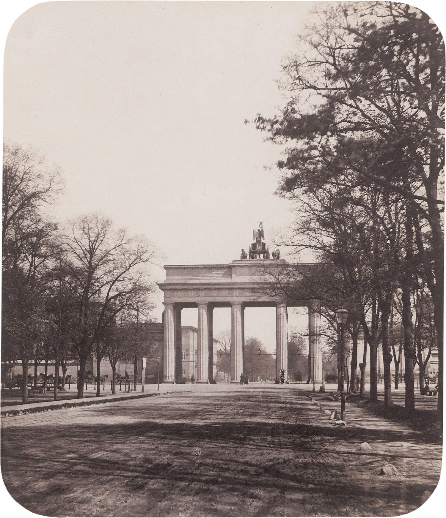 Charlottenburger Chaussee with view of Brandenburg Gate towards Unter den Linden, Berlin. 1856. Gold-toned salted paper print with rounded corners. 19,5 x 16,5 cm. Mounted to board, titled in pencil below the image on the mount.