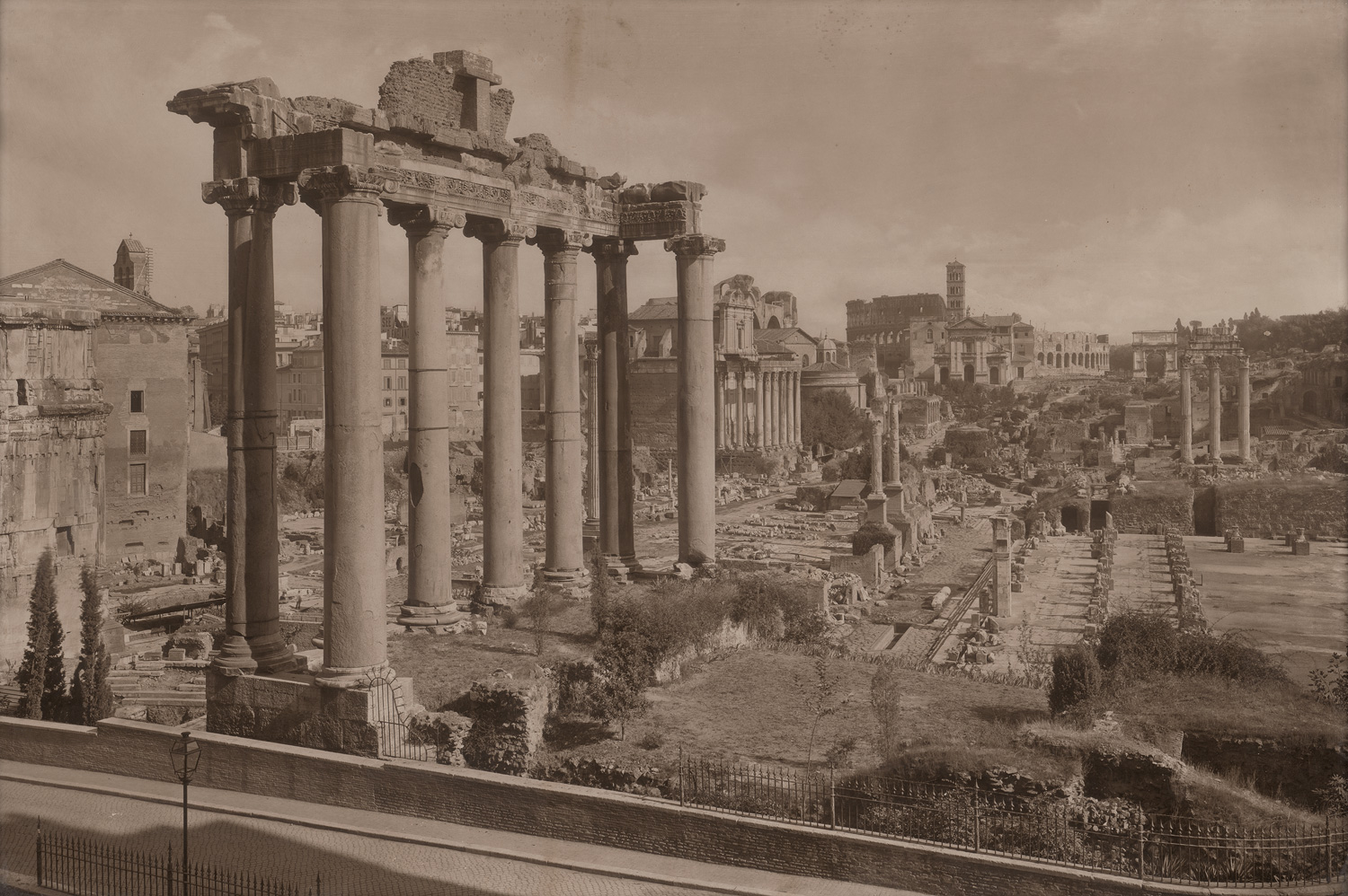 View of the Forum Romanum. Circa 1900. Sepia-toned gelatin silver print. 60 x 87 cm. Photographer's blind stamp in lower right corner, framed under glass in contemporary wooden frame (73 x 100 cm).
