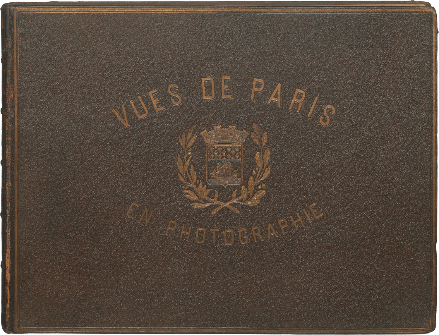 Vues de Paris en Photographie. 1855-1860. 26 albumen prints, mounted to album leaves. Each ca. 20 x 27 cm (31,5 x 42,5 cm). Each with the photographer's “E. Baldus” stamp below the image on the mount. Presented in contemporary full-leather folio album with gilt-stamped title “Vues de Paris en Photographie” and the arms of the City of Paris on the front board; spine with raised bands and gilt tooling.