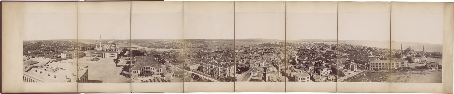 Panorama de Constantinople. 1880s. Panorama comprising 8 albumen prints. Each circa 22 x 16 cm (entire size circa. 22 x 134 cm). Mounted to original boards, joined at the folds with linen tape, housed in the original burgundy half-leather and canvas portfolio with embossed title and ornamentation. With unidentified dedication in ink on rear endpaper.