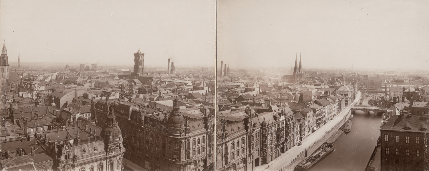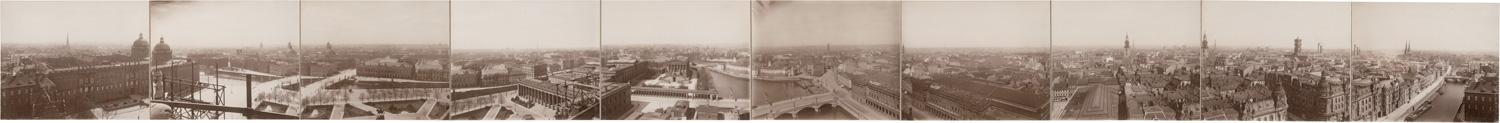 Photographer: Otto Raschdorff (1854-1917). Panorama von Berlin. Circa 1903. Panorama consisting of 10 collodion paper prints, mounted to original boards. Each circa 23 x 28,5 cm (entire size 23 x 286 cm). Joined at the folds with linen tape, with marbled front endpapers, housed in the original gray canvas portfolio with gilt-stamped title and ornamentation.