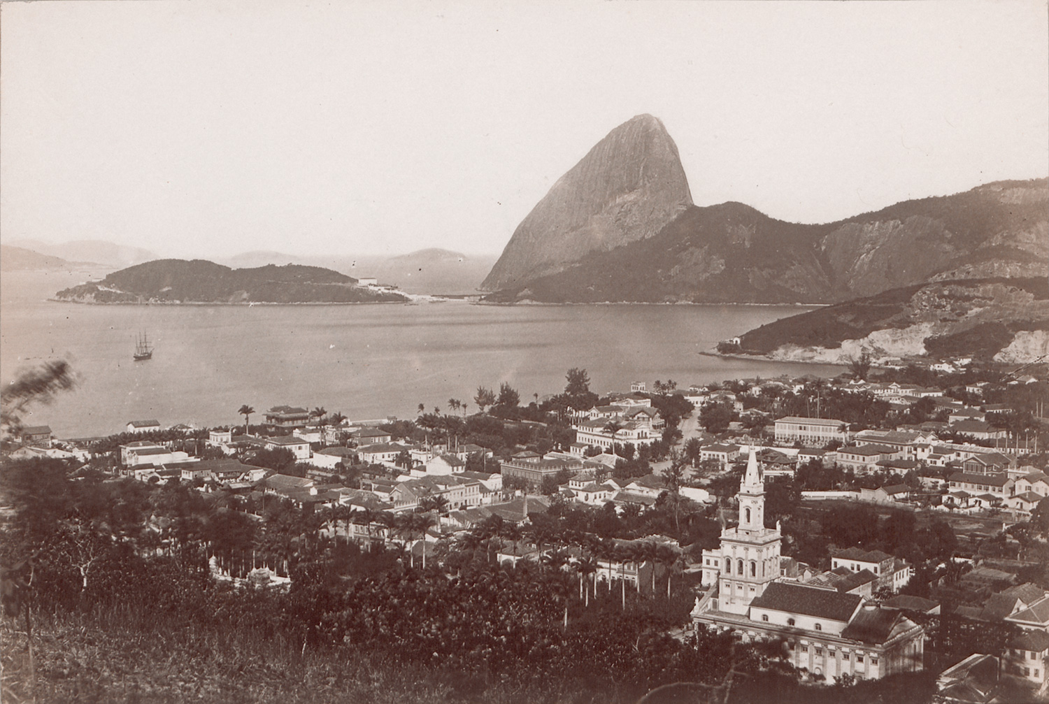 This group of photographs includes sweeping views of Rio de Janeiro with landmarks such as Sugarloaf Mountain, the Candelária Church, and Rua do Ouvidor; views of Salvador and its hillside architecture; scenes from the province of Minas Gerais with farm buildings and mule trains; as well as botanical gardens, waterfalls, and bustling port towns. – Some prints slightly faded along the edges with scuff-marks and light surface irregularities; otherwise most with rich tonal range in good to very good condition.