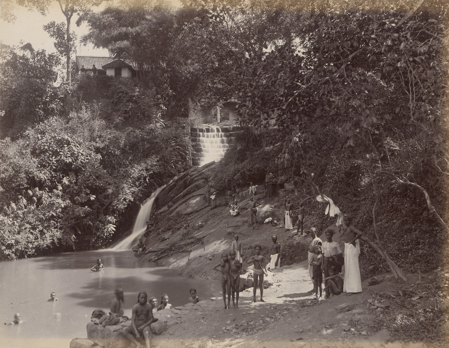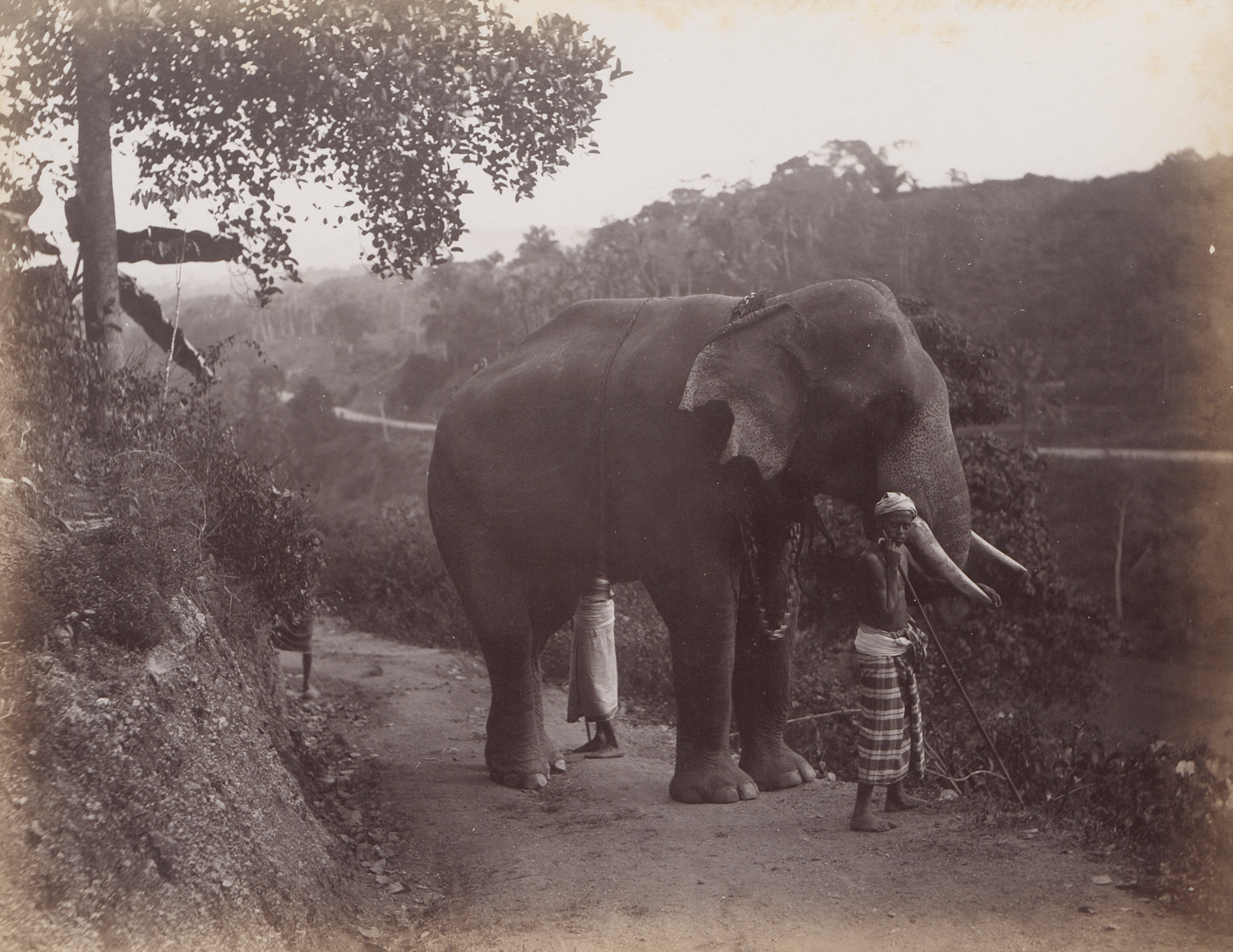 This group of photographs offers a vivid visual record of late 19th-century Ceylon under British colonial rule. The images range from tea plantations with Tamil laborers harvesting leaves to bathing scenes at a stepped dam and architectural views of Colombo and Kandy, including temples, riverbanks, and the harbor. Also shown are scenes of daily life, such as villagers in front of a thatched house, a mahout with his elephant, and carts passing beneath towering banyan trees. – Some fading, especially around the edges, some scuff marks and handling creases, small tear on mount of one print, otherwise all in good condition.
