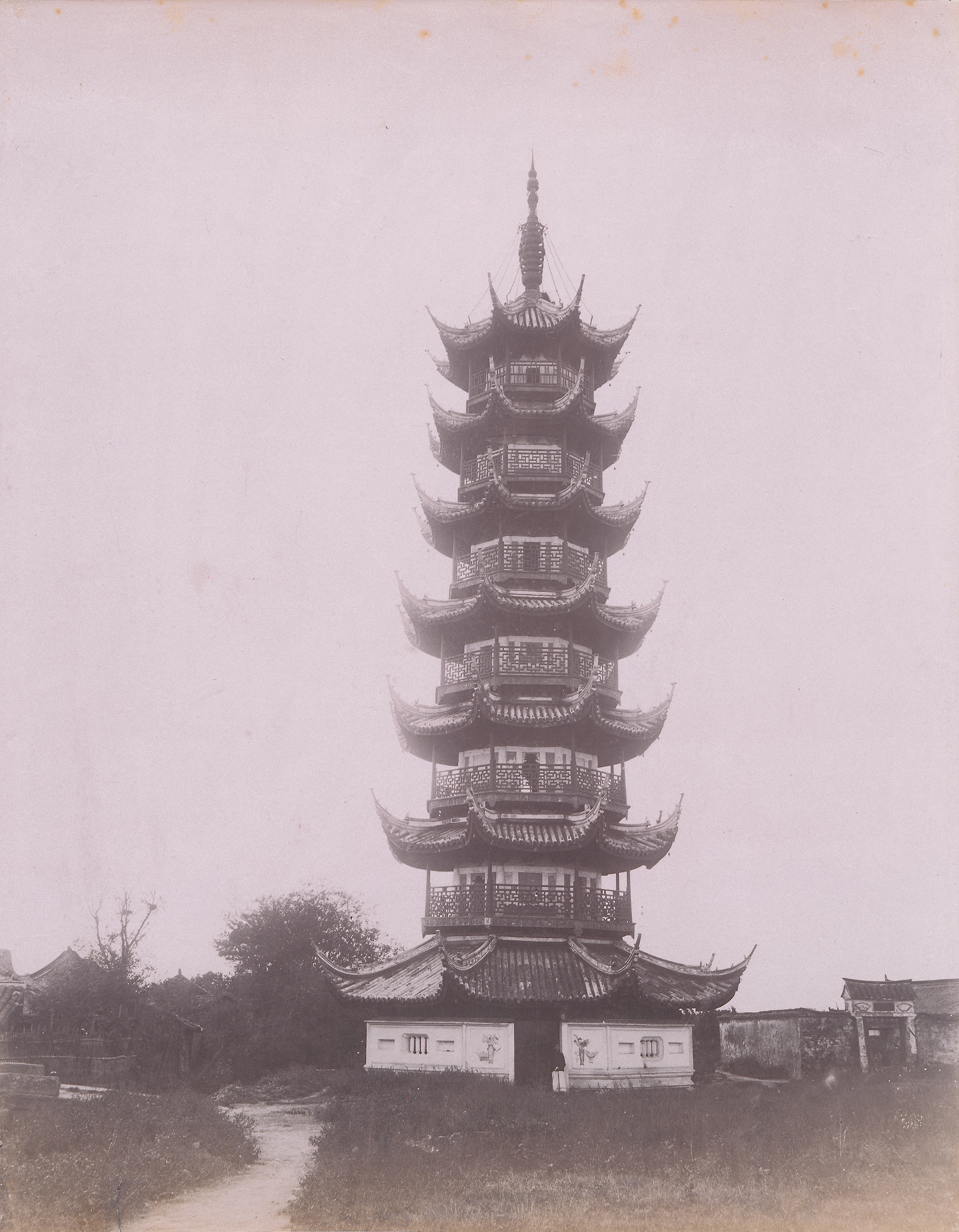 Taken across several locations in southern China, this group includes views and portraits likely made in and around Canton (Guangzhou), Hong Kong, Shanghai, and Macau in the late 19th century. The photographs depict pagodas, temple grounds, stone bridges, the Willow Pattern Tea House, Tianfei Gong temple, and streets such as Queen’s Road and Boone Road. Also featured are village scenes, harbor areas, and studio portraits of Chinese women and girls in traditional dress, some with bound feet. – Some fading, foxing, and discoloration on some prints; some scuff marks; otherwise all in good to very good condition.