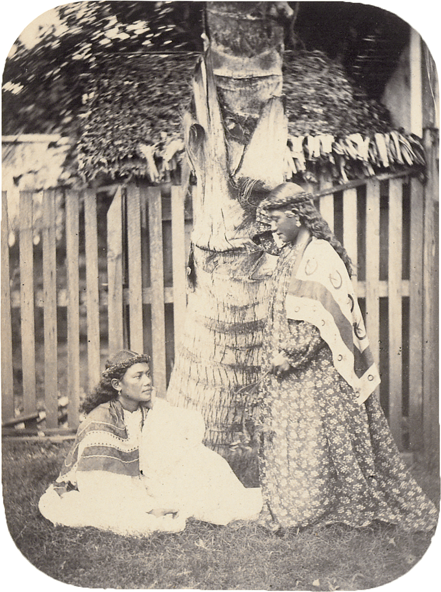 Souvenirs de l’Ile Tahiti et des Marquises. 1863. 21 albumen prints, mounted to album pages. Each ca. 11 x 15,5 cm or reverse (22 x 29 cm). Each with “Courret Hermanos Fotógrafos Calle Mercaderes 197, Lima” blind stamp on the mount, annotated in black ink below the image. Bound in green half-leather album with gilt-stamped title "Souvenirs de l’Ile Tahiti et des Marquises" in rhombus cartouche on front cover. Housed in a custom clamshell box covered in green faux-leather with mounted printed title label bordered by four diamond-shaped wooden inlays (entire size 30 x 41 cm).