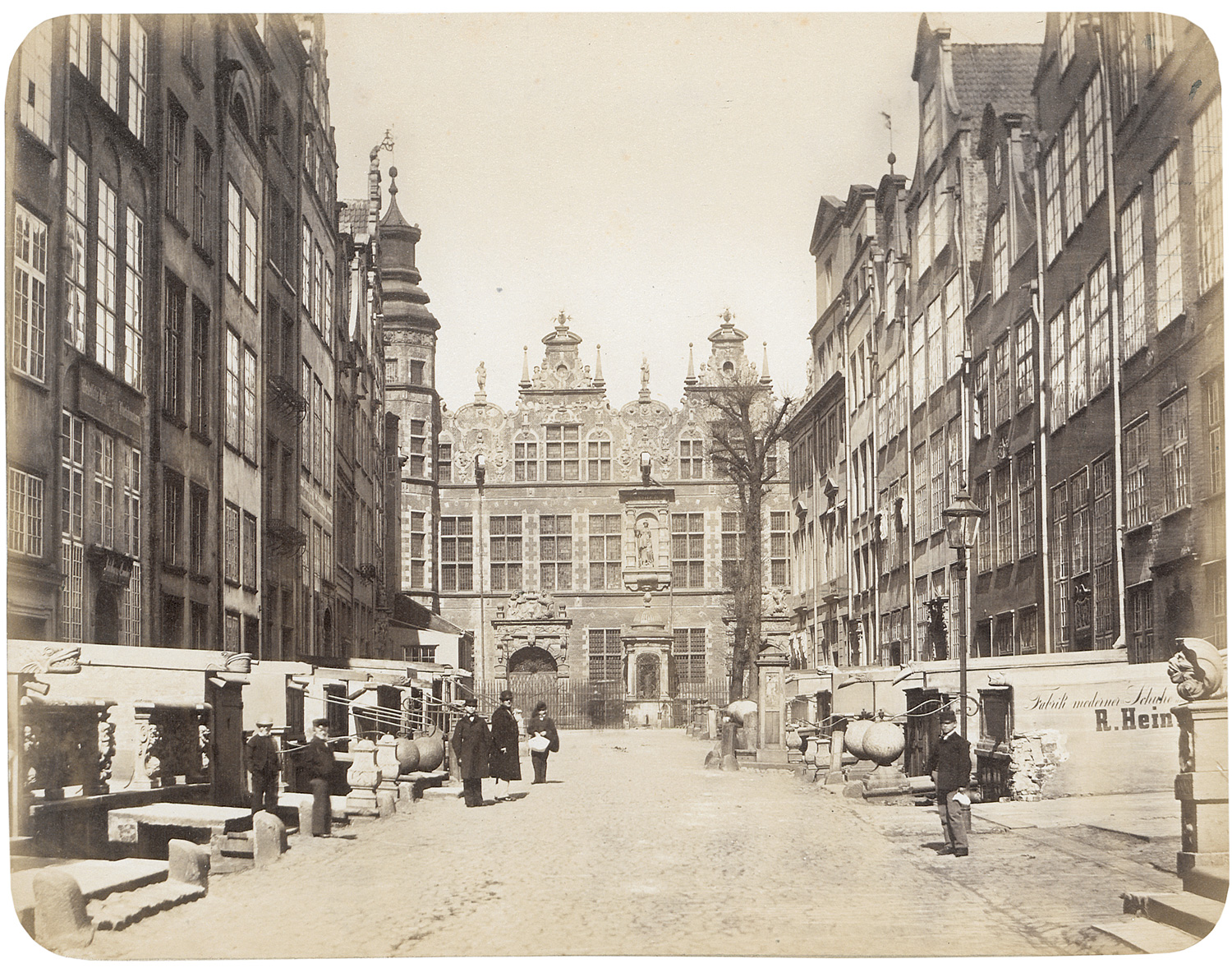 A striking visual record of late 19th-century Danzig (now Gdańsk), this group includes views of significant civic and architectural landmarks of the historic Hanseatic city. Depicted are the Artus Court (Artushof), the Golden Gate (Langgasser Tor), the Great Armory (Großes Zeughaus), the Green Gate (Grünes Tor), the Old City Hall, and the Marienkirche from various perspectives, including panoramic views of the historic center. Many views are animated with horse-drawn carriages and passersby, offering a glimpse of urban life in the Prussian-era city. The photographs, distinguished by sharp detail and balanced compositions, reflect Ballerstadt’s skill in capturing both architectural grandeur and atmospheric cityscapes. – Minimal foxing on the mounts; some light fading on a few prints. Otherwise, all prints with strong tones and in near excellent condition.