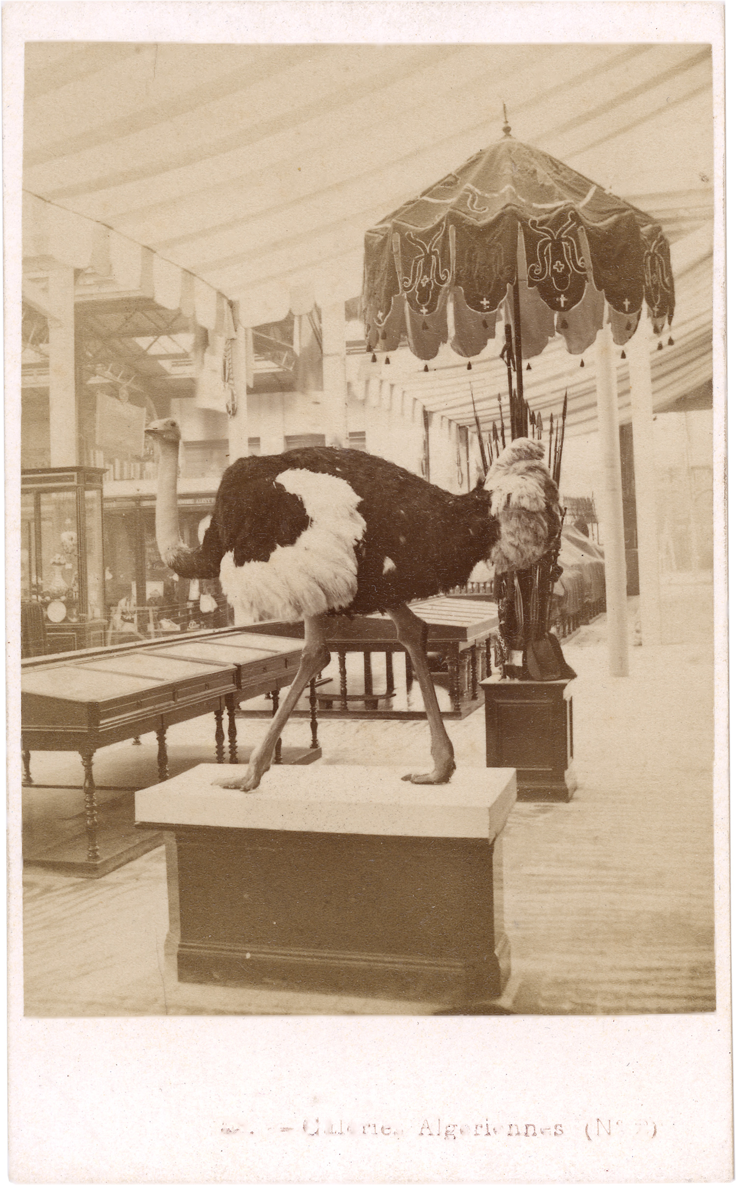 This group of cartes-de-visite offers a richly detailed visual record of the Exposition Universelle of 1867, the second world’s fair held in Paris under Napoleon III. Organized on the Champ de Mars, the exhibition brought together over 50,000 exhibitors from across the globe, showcasing cutting-edge achievements in industry, agriculture, and the arts. The photographs document a wide array of national and thematic sections - including the Galerie du Travail, Beaux-Arts pavilions, and colonial displays such as the Galeries Algériennes - as well as highly detailed interior views of individual booths featuring machine tools, fine ceramics, taxidermied ostriches, ornamental zincwork, and more. Captured and distributed by the Parisian firm Léon & Lévy, these images were originally taken as glass stereoscopic negatives and later adapted to the popular carte-de-visite format for wide dissemination. – Some fading, scuff marks, and traces of silver mirroring in the shadow areas; otherwise all in good to very good condition.