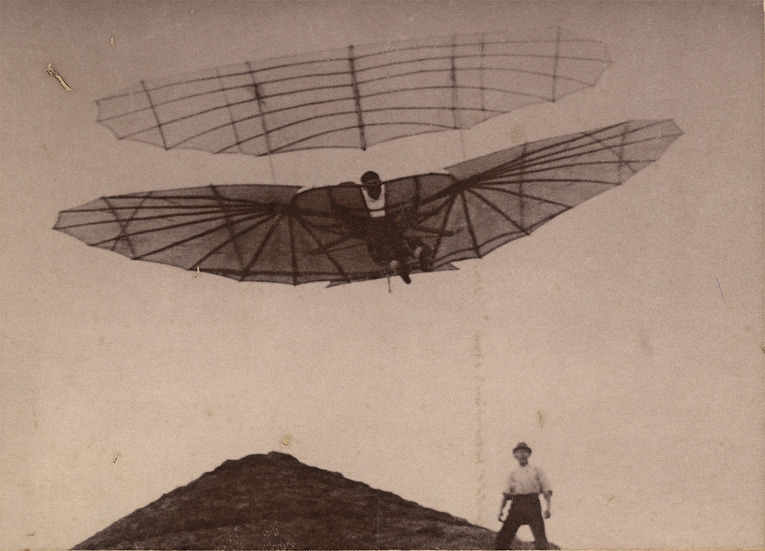 Photographers: Dr. Richard Gustav Neuhauss (1855-1915), A. Regis and others. Otto Lilienthal flying his gliding planes at Rhinower Berge (Maihöhe-Rhinow) and Fliegeberg, Berlin-Lichterfelde. 1893-96. 8 vintage gelatin silver prints, mounted to boards. Various sizes between 16,4 x 22 cm and 10 x 13 cm. Some captioned in white ink below the image on the mount.