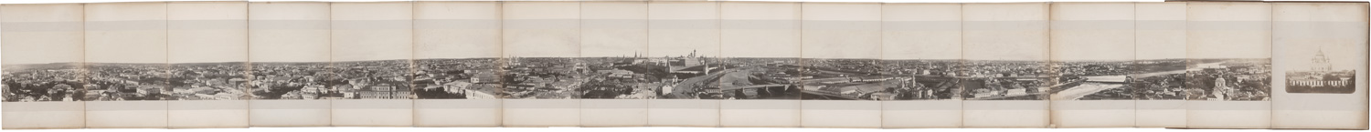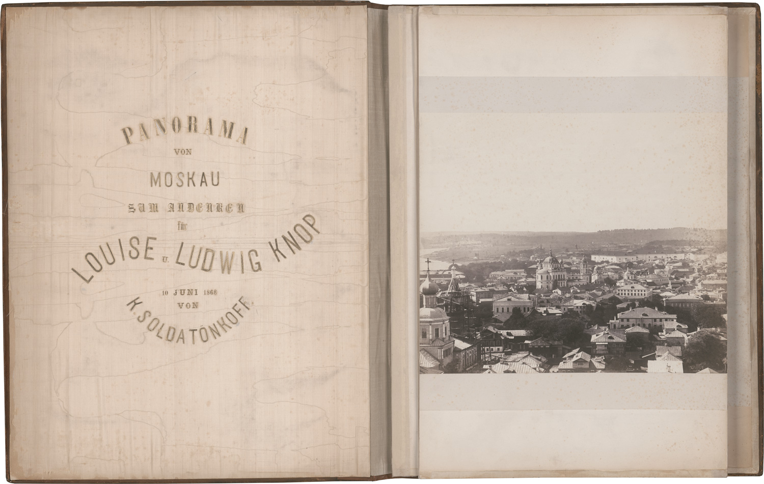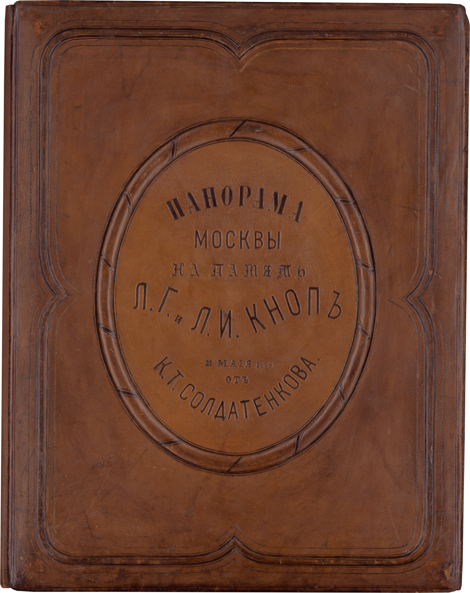 Photographers: Scherer & Nabholz (active ca. 1860-1868), published by Kozma Terentyevich Soldatyonkov (1818-1901). Panorama von Moskau. 1867. 16 albumen prints, mounted to boards and joined with paper tape into an accordion-fold panorama. Each ca. 34 x 40 cm (entire size: ca. 640 x 61 cm). Additional mounted albumen print (ca. 27 x 33 cm) on the inside of the rear board, depicting the Cathedral of Christ the Savior. Bound in full-leather album with raised decorative border and large embossed presentation in Russian within raised oval frame on upper cover; front pastedown with gilt-stamped presentation inscription in German: “Panorama von Moskau. Zum Andenken für Louise u. Ludwig Knop. 10 Juni 1868 von K. Soldatonkoff.”