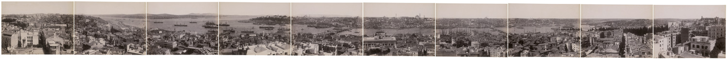Panorama de Constantinople pris de la Tour de Galata. Circa 1880. Panorama consisting of 10 albumen prints. Each circa 25 x 33,5 cm (entire size circa 25 x 340 cm). Mounted to original boards, bound together with linen tape at folds, in original red canvas portfolio with gilt-stamped title and ornament.