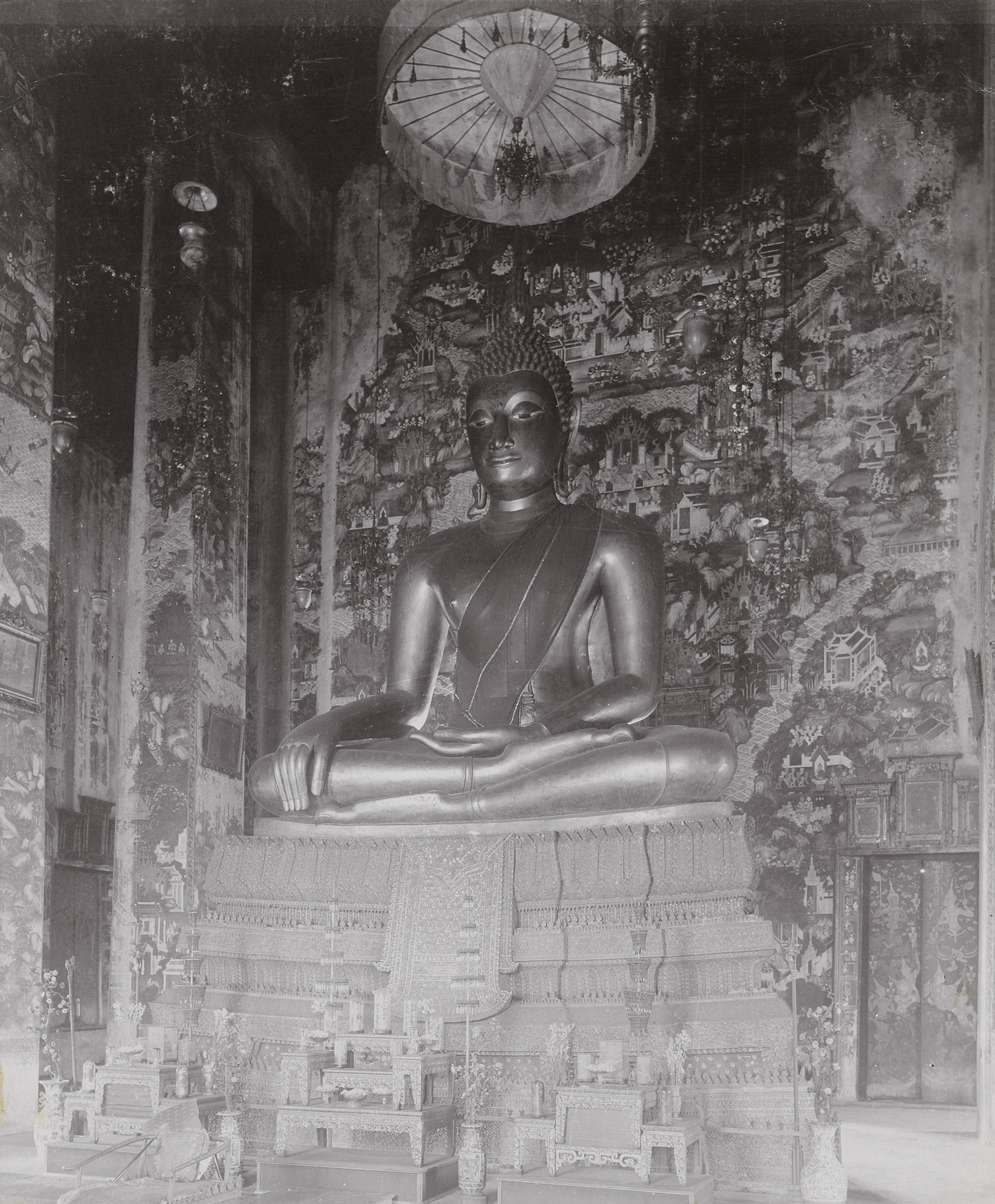 This group of photographs records significant religious, architectural, and urban sites in Siam and British Burma during a documented journey in late 1906. Among the Bangkok scenes are canal-side dwellings near the Golden Mount (Wat Saket), temple complexes such as Wat Pho and Wat Suthat, and detailed views of the Grand Palace and Wat Phra Kaeo. Further images show the island temple of Phra Samut Chedi at Paknam, the Shwe Dagon Pagoda in Rangoon from multiple vantage points including the Royal Lake and Cantonment Gardens, and distinctive scenes of Mandalay, including palace walls and a large monastic structure. – Some light scuff marks and minor oxidation along the edges of some prints, otherwise all in very good condition.