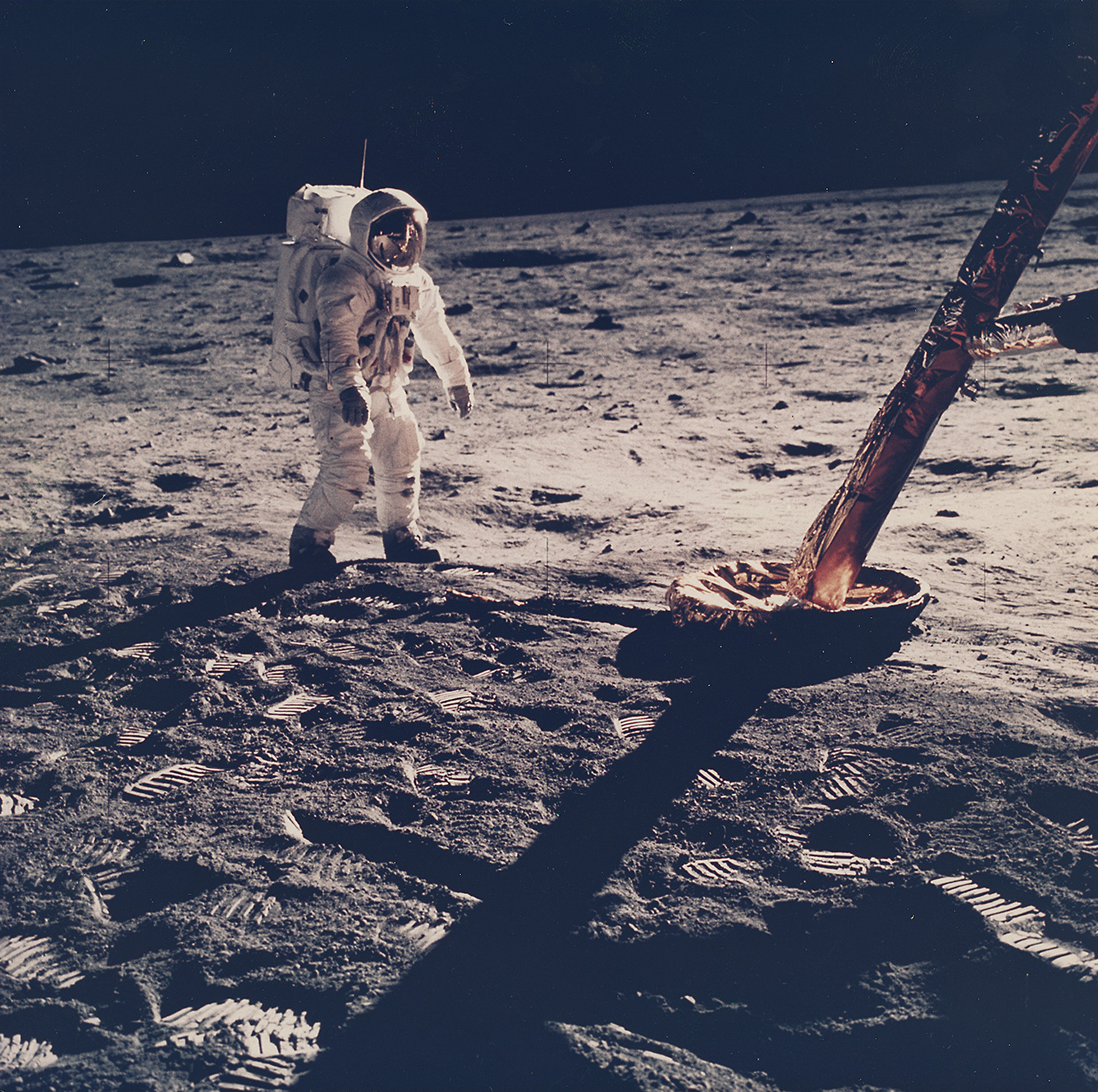 Photographer: Neil Armstrong (1930-2012). Buzz Aldrin near the Lunar Module footpad, Apollo 11. July 1969. Vintage chromogenic print. 20,2 x 20,2 cm. "A Kodak Paper" watermark on the verso.