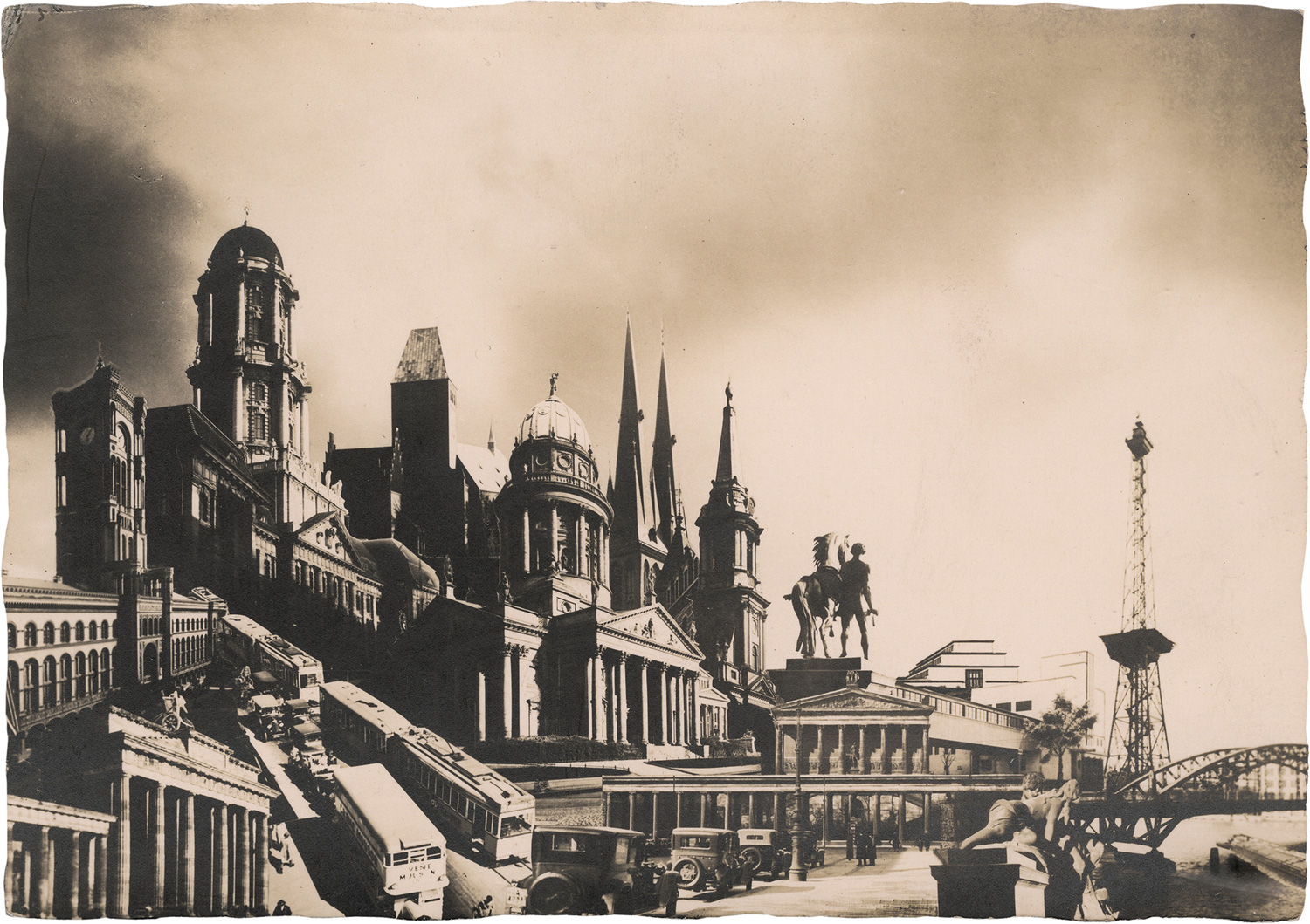 These dynamic and modern photomontages by Albert Vennemann reflect the energy and rapid transformation of Berlin into a cosmopolitan metropolis. Known as the “creator of the face of a cosmopolitan city,” Vennemann produced striking photo postcard series such as "Das schöne Berlin" (Beautiful Berlin) and "Das neue Gesicht Berlins" (The New Face of Berlin), in which he combined images of streets, train stations, commercial and industrial buildings into visionary urban compositions. Beyond his work as a commercial photographer, Vennemann supplied imagery for emerging forms of city marketing, including the Berlin advertising magazine Der Wochenspiegel (first published in 1925) and the tourism campaign "Jeder einmal in Berlin" (Everyone Once in Berlin). – Slight mirroring in edges and dark areas, otherwise in very good condition.