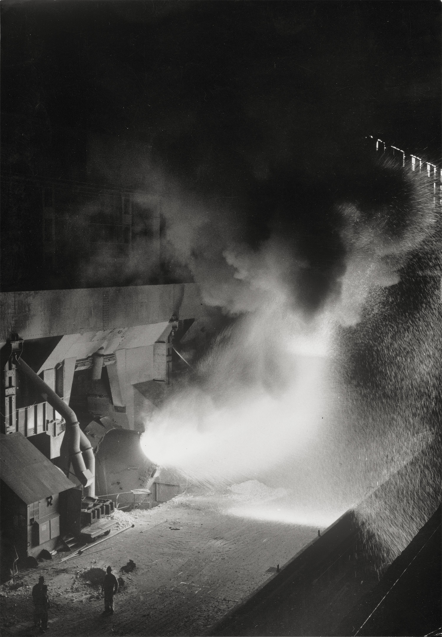 Industrial images (including 1 solarized print). 1960s. 5 vintage ferrotyped gelatin silver prints, 4 on Agfa-Brovira paper. Each between 30 x 23 cm and 29,5 x 20,5 cm. 3 with photographer’s stamp and 2 annotated by the photographer in pencil on the verso.