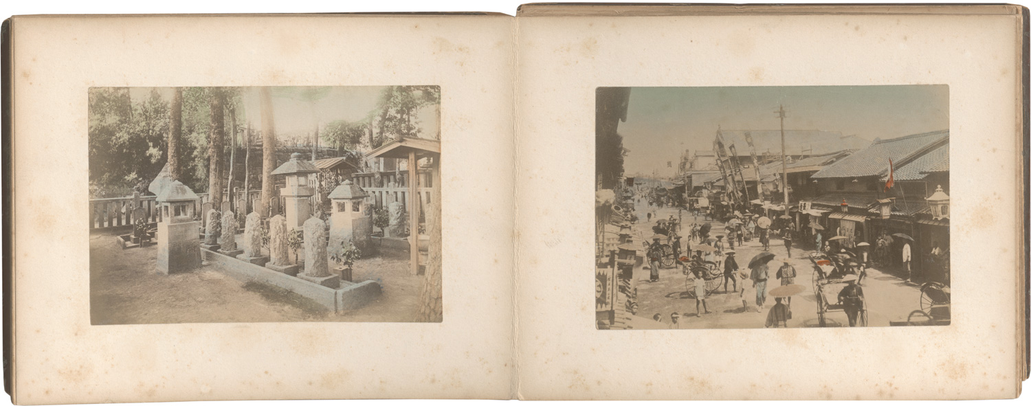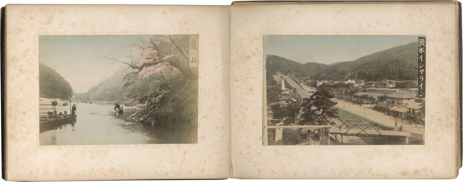 Schönes Japan-Souveniralbum im zeittypischen Lackeinband in Leporellobindung. Rund 25 Aufnahmen mit malerischen Landschafts-, Stadt- und Hafenimpressionen, die übrigen Photos zeigen die Bevölkerung bei verschiedenen landestypischen Tätigkeiten. – Die Photos teils etwas verblasst, die Trägerkartons mal mehr, mal weniger stockfleckig, die Photos jedoch kaum betroffen. Ein Albumfalz mit Transparentstreifen verstärkt.