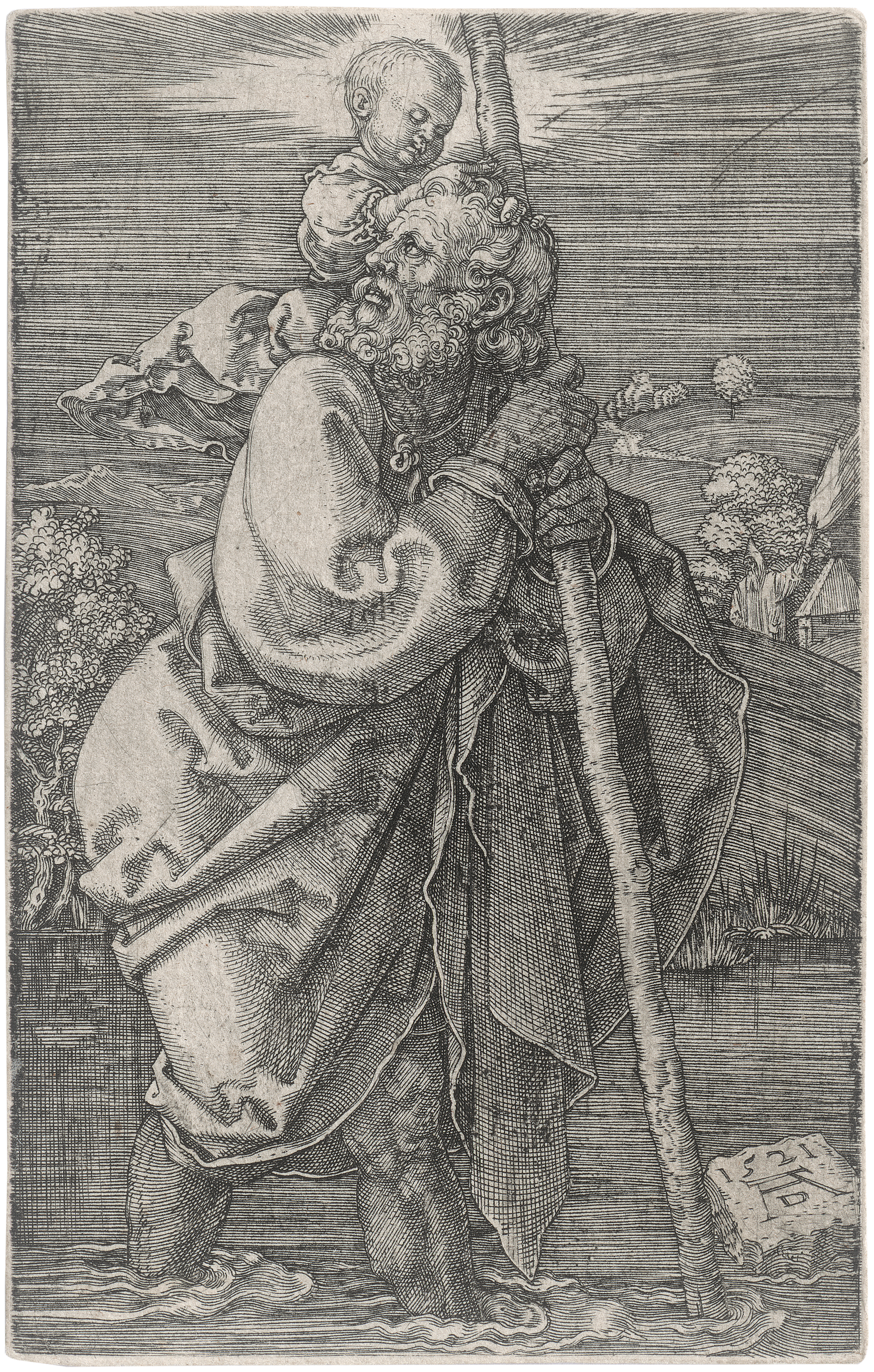 Der hl. Christopherus mit zurückgewandtem Kopfe. Kupferstich. 11,7 x 7,4 cm. 1521. B. 58, Meder 53 wohl c (von d).