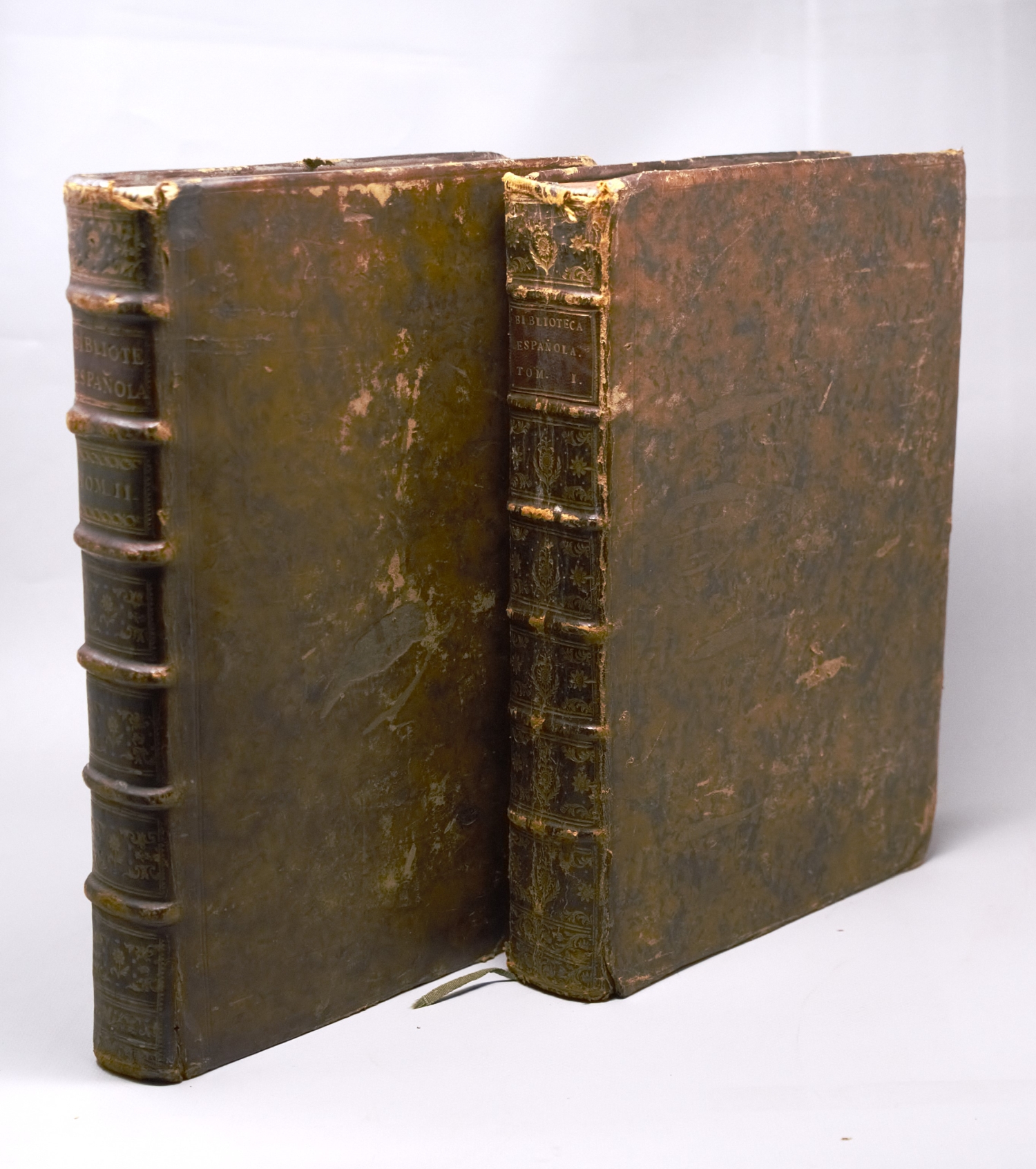 Castro, José Rodríguez de. Biblioteca espanola. 2 Bände. 17 Bl., 668 S., 84 Bl; 5 Bl., 748 S., 1 Bl. 32,5 x 22 cm. Marmoriertes Kalbsleder d. Z. (beschabt, bestoßen, Kapitale mit Einrissen und kleinen Fehlstellen, sowie Deckeln mit Fehlstellen) mit goldgeprägem RSchild und reicher RVergoldung. Madrid, Real de la Gazeta, 1781-1786.