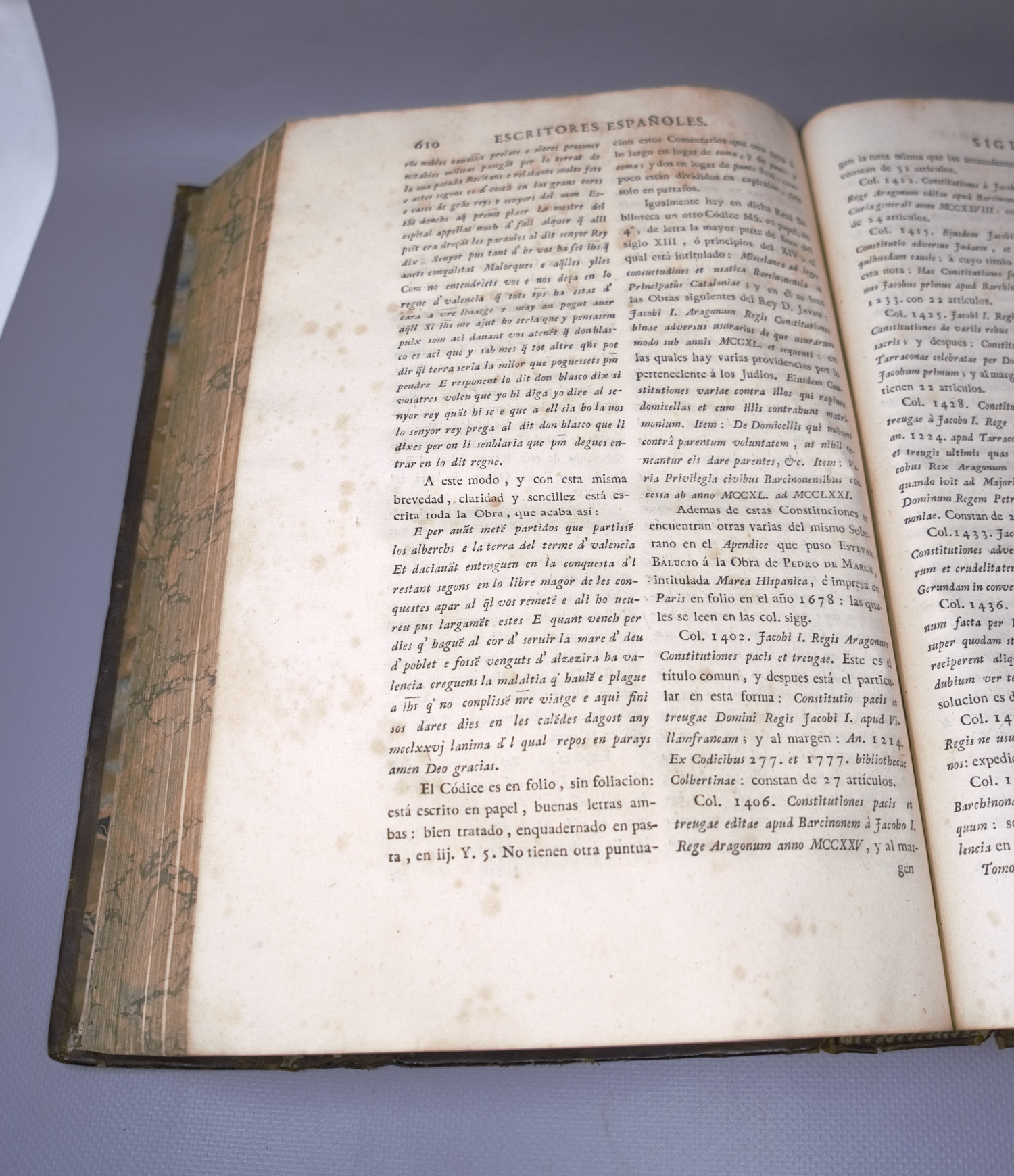 Hoefer IX, 132. – Erste Ausgabe des Werkes zur spanischen Bibliothek mit ausführlich kommentierter Bibliographie von dem Orientalisten, Hebraisten und bedeutenden Bibliothekar José Rodríguez de Castro (1739-1799). Dieser betreute die Bilbiotheken der spanischen Könige Karl III. und Karl IV. und fertigte als sein Hauptwerk das vorliegende Opus Magnum an. De Castro "fue discípulo y colaborador de Miguel Casiri y emprendió la edición de una ambiciosa Biblioteca Española (1781-1786) redactada en castellano y cuyo primer tomo se imprimió significativamente un año antes que la reedición de las Bibliothecas de Nicolás Antonio. La obra pretendía hacer una gran reseña bibliográfica de la producción rabínica española; sin embargo, recibió importantes vapuleos críticos por parte de Tomás Antonio Sánchez y Juan Antonio Pellicer. Murió prematuramente sin haber logrado publicar el tomo tercero." (Wikipedia 22.05.25). – Titel etwas braun-, finger- und feuchtfleckig, insgesamt leicht stockfleckig, vereinzelt feuchtrandig, gewellt und mit Gebrauchsspuren. Mit einem zeitgenössischem Besitzvermerk sowie einem gelöschtem Besitzvermerk auf dem Titel. Rücken leicht abweichend gebunden.